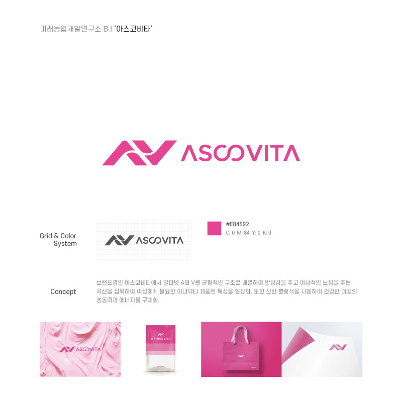 브랜드명인 아스코비타에서 알파벳 A와 V를 균형적인 구조로 배열하여 안정감을 주고 여성적인 느낌을 주는 곡선을 접목하여 여성에게 필요한 이너뷰티 제품의 특성을 형상화 하였습니다.