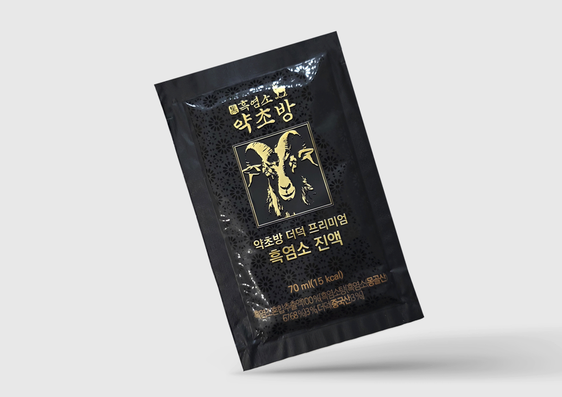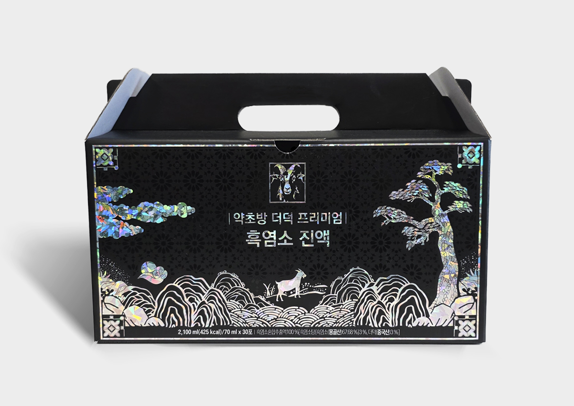 전통자개 느낌의 상자와 흑염소의 힘있는 느낌을 검정색바탕에 골드로 표현
