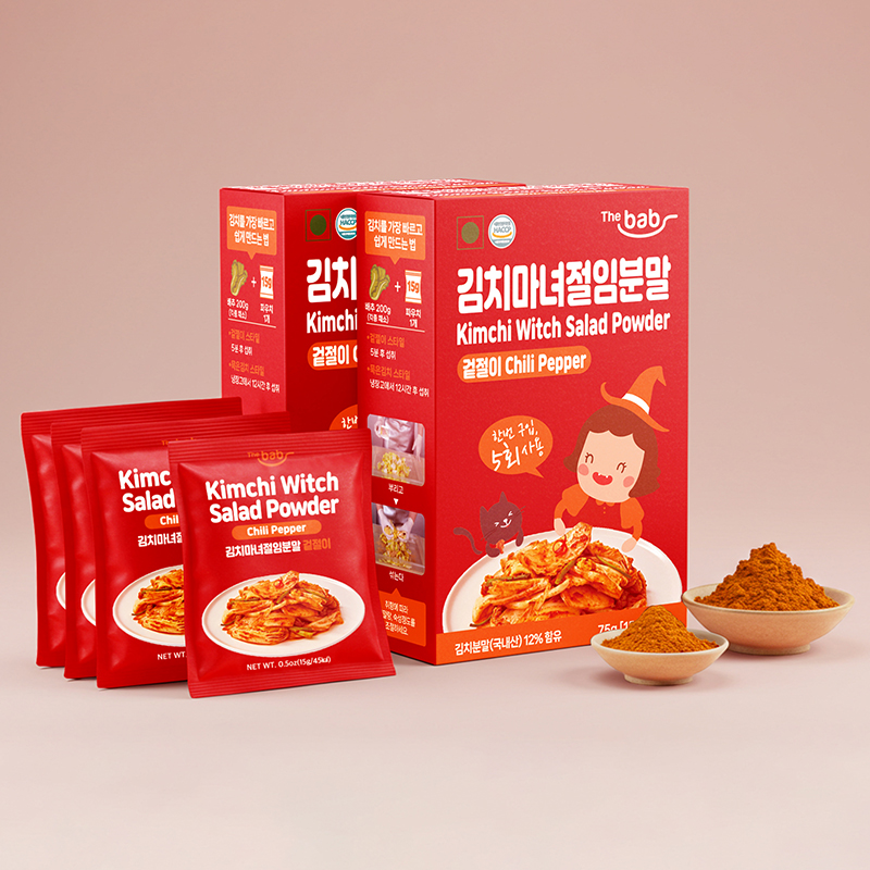 • 디자인 컨셉김치 분말 박스 패키지입니다. 해외 수출용이므로 한글과 영문을 섞었으며, 배경에 빨강색을 사용하여 김치의 매운 맛을 표현했습니다.