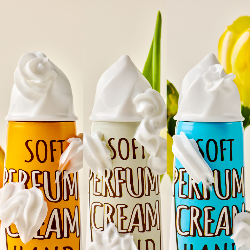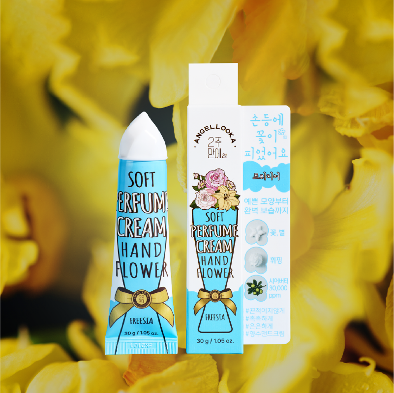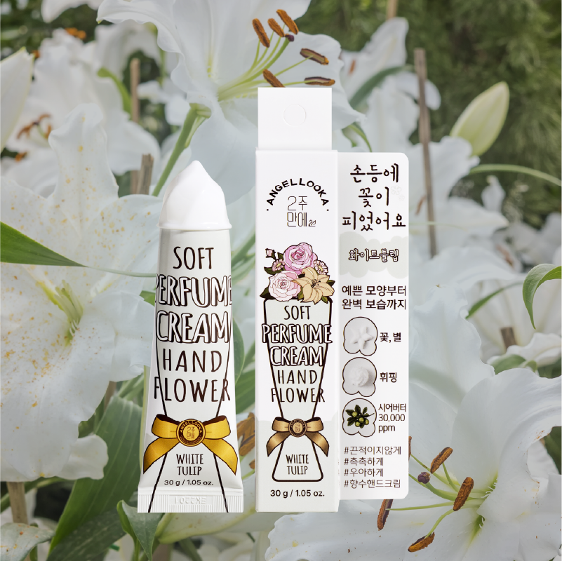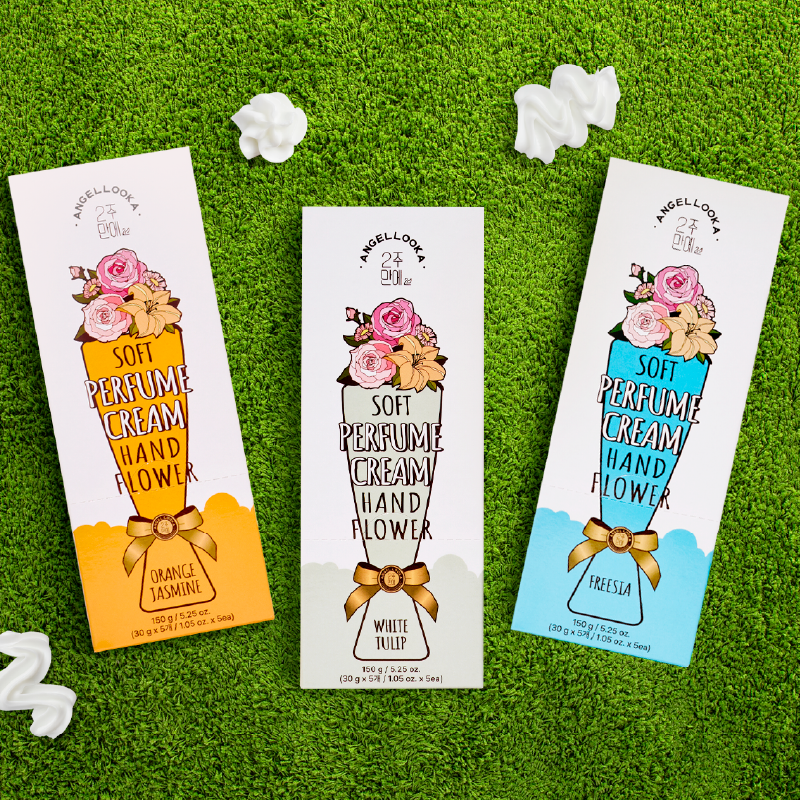 • 디자인 컨셉엔젤루카의 CVS 타겟 브랜드로, CU 편의점 론칭을 위해 기획된 핸드크림 패키지입니다. 3가지 향을 컬러로 구분해 직관성을 높이고, 꽃다발 콘셉트와 특수 캡을 적용해 꽃 모양으로 연출되는 디테일을 더했습니다.