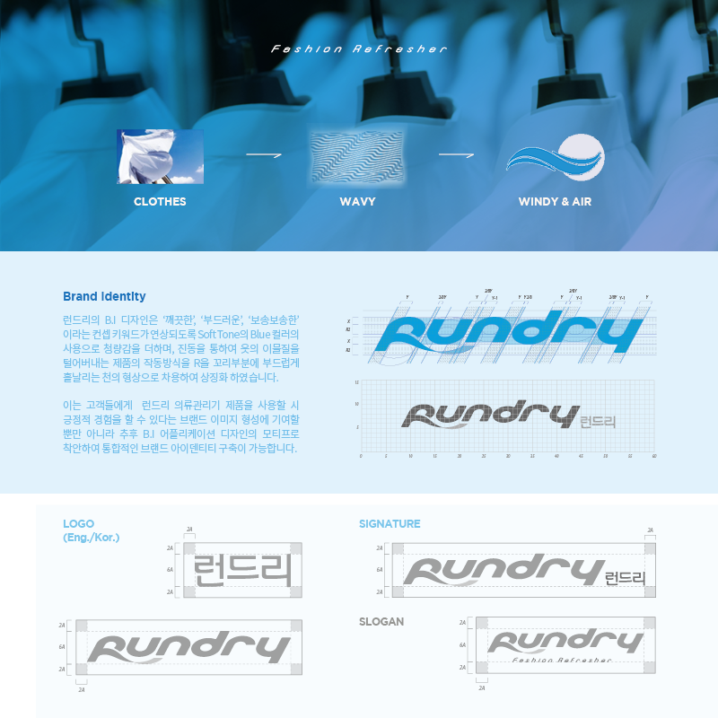 Modern & Fun - 신뢰(안전)와 위트(가벼움&깨끗함)의 공존 Cleanly & Refreshing - 의류관리기기의 청결함을 상징하는 Blue Color의 Tone-on-Tone 배색 Intuitive & Feature - 차별화된 제품의 시각언어 구축