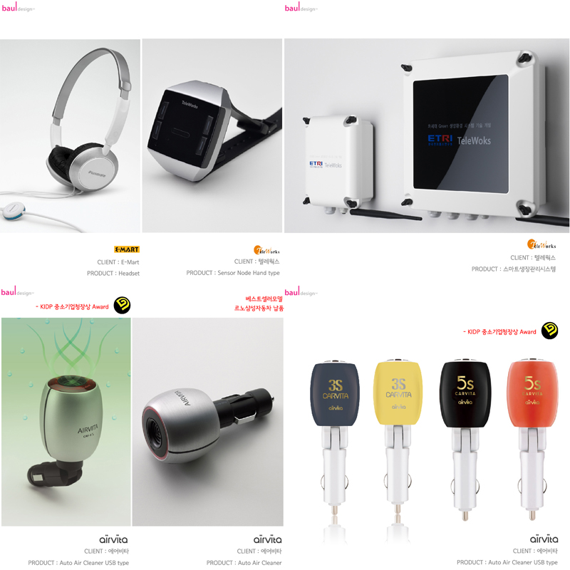 기업아이덴티티를 적용한 이어폰 및 MP3 플레이어, 차량용 공기청정기등 우리 생활에서 사용되어지는 전자제품, 의료기기등에 대한 제품 디자인입니다.