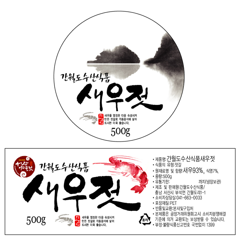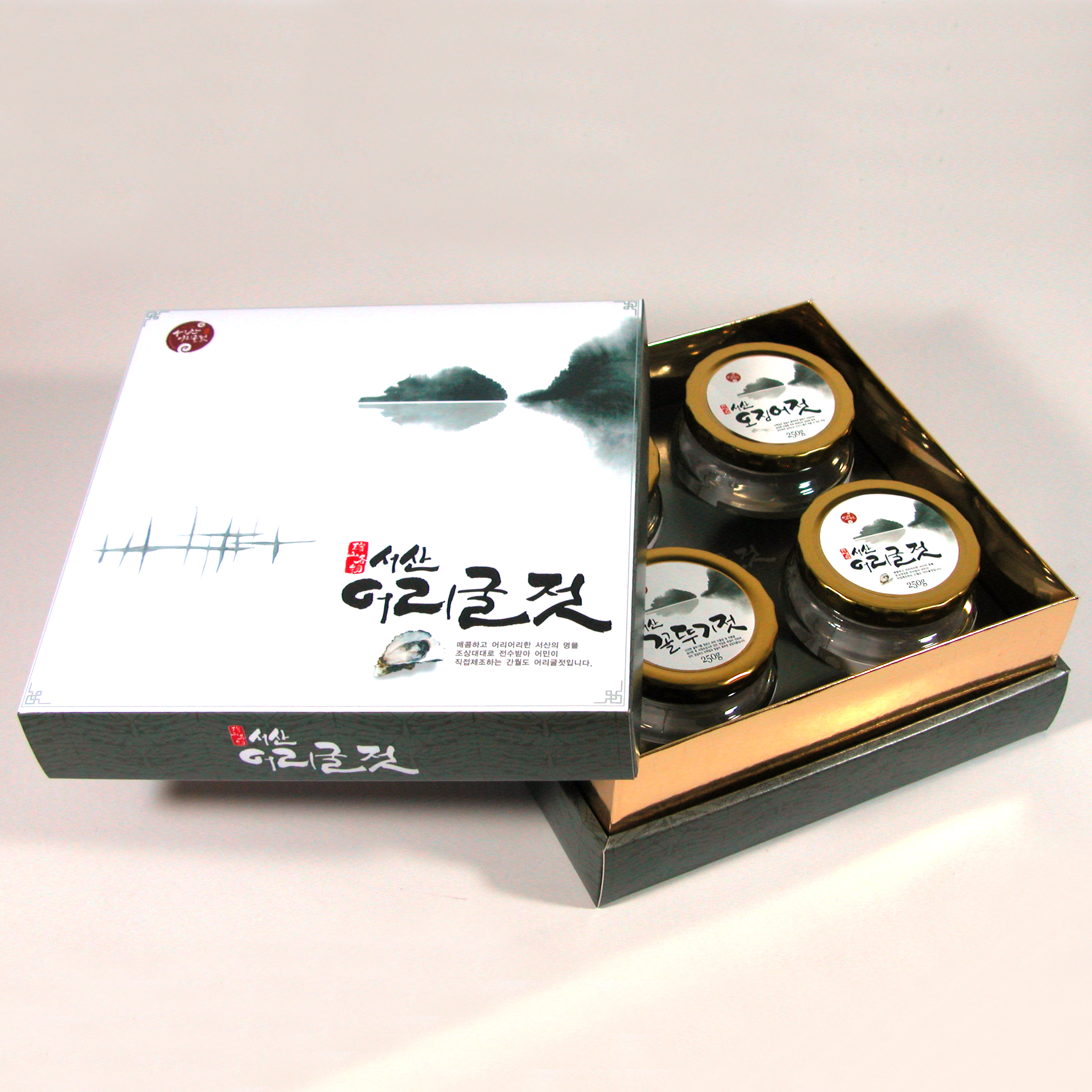 서해안의 갯벌과 어리굴젓의 이미지를 묵화와 캘리로 이야리를 전개하듯 스토리텔링을 적용한 포장디자인 이다.