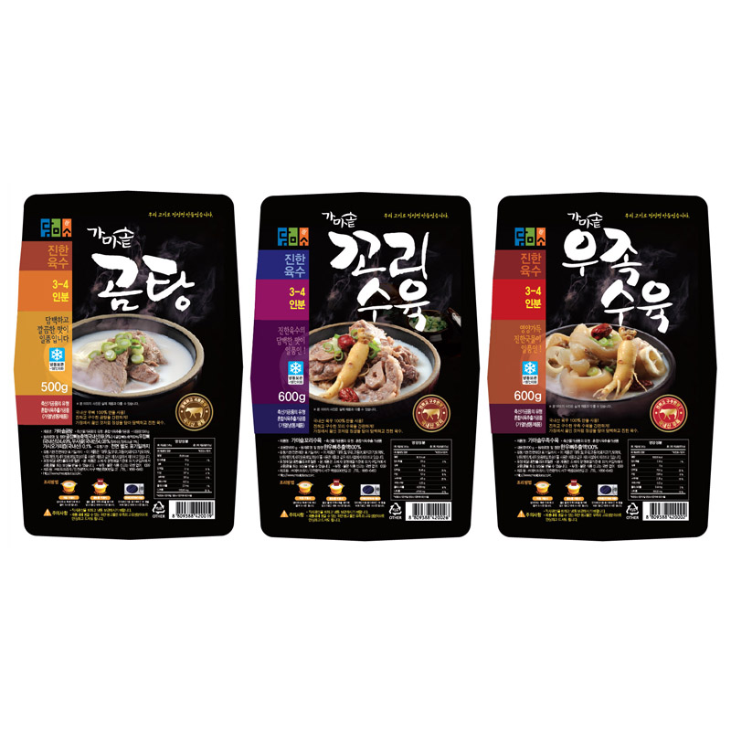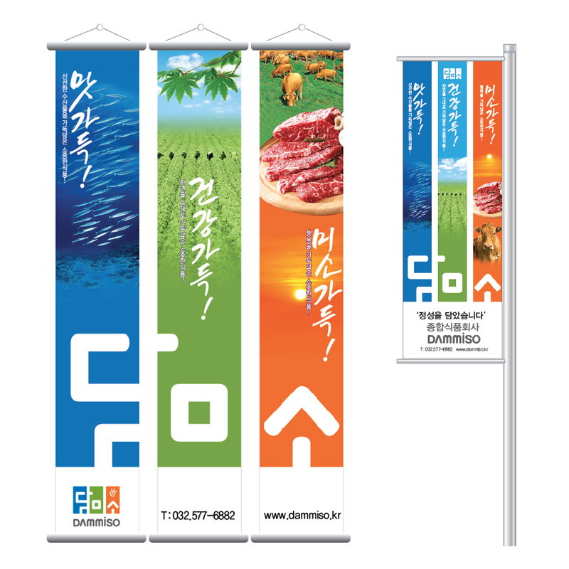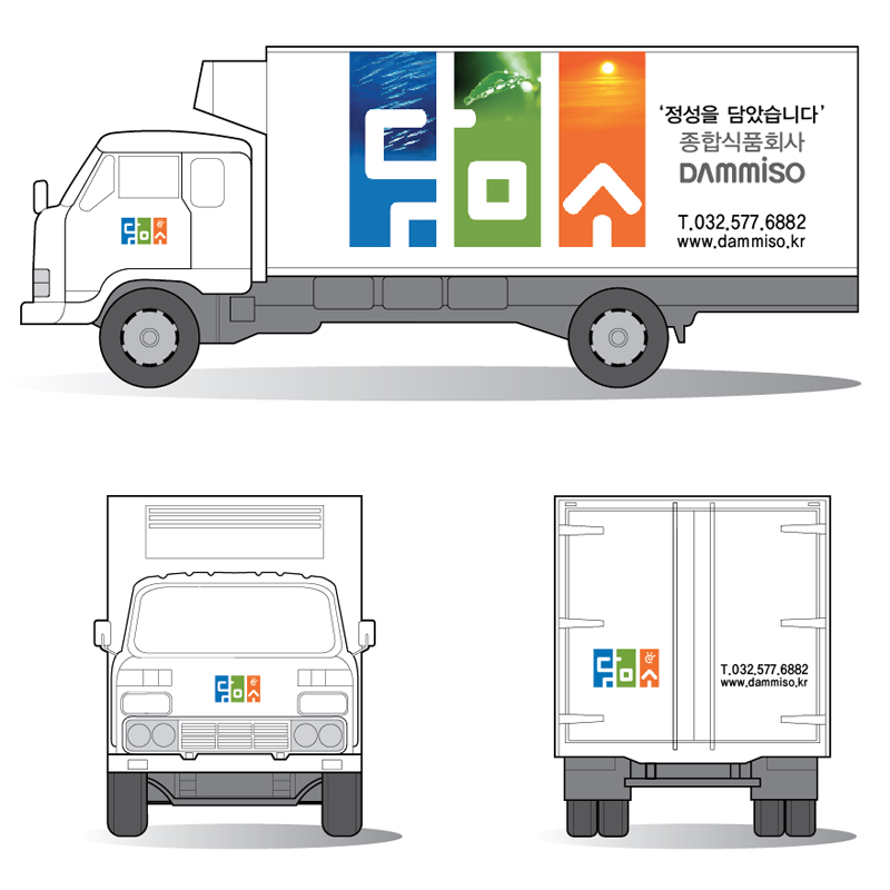 담미소의 가독성을 주고 면 분할을 활용하여 종합식품회사의 농산, 수산, 축산의 느낌을 시각화 하였다. 하늘, 땅, 바다를 연상시켜 한글과의 조화를 통해 자연의 맛을 담는 장소를 함축하고 있다.