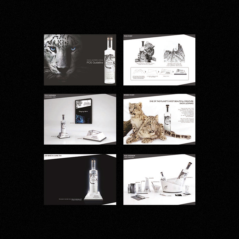 썸코리아는 스노우 레오파드 보드카의 비주얼 / 버벌 아이덴티티를 개발하였습니다. 멸종위기의 스노우 레오파드를 돕기 위해 만들어진 브랜드의 성격과 보드카가 가지는 프리미엄을 브랜드에 담아냈습니다.