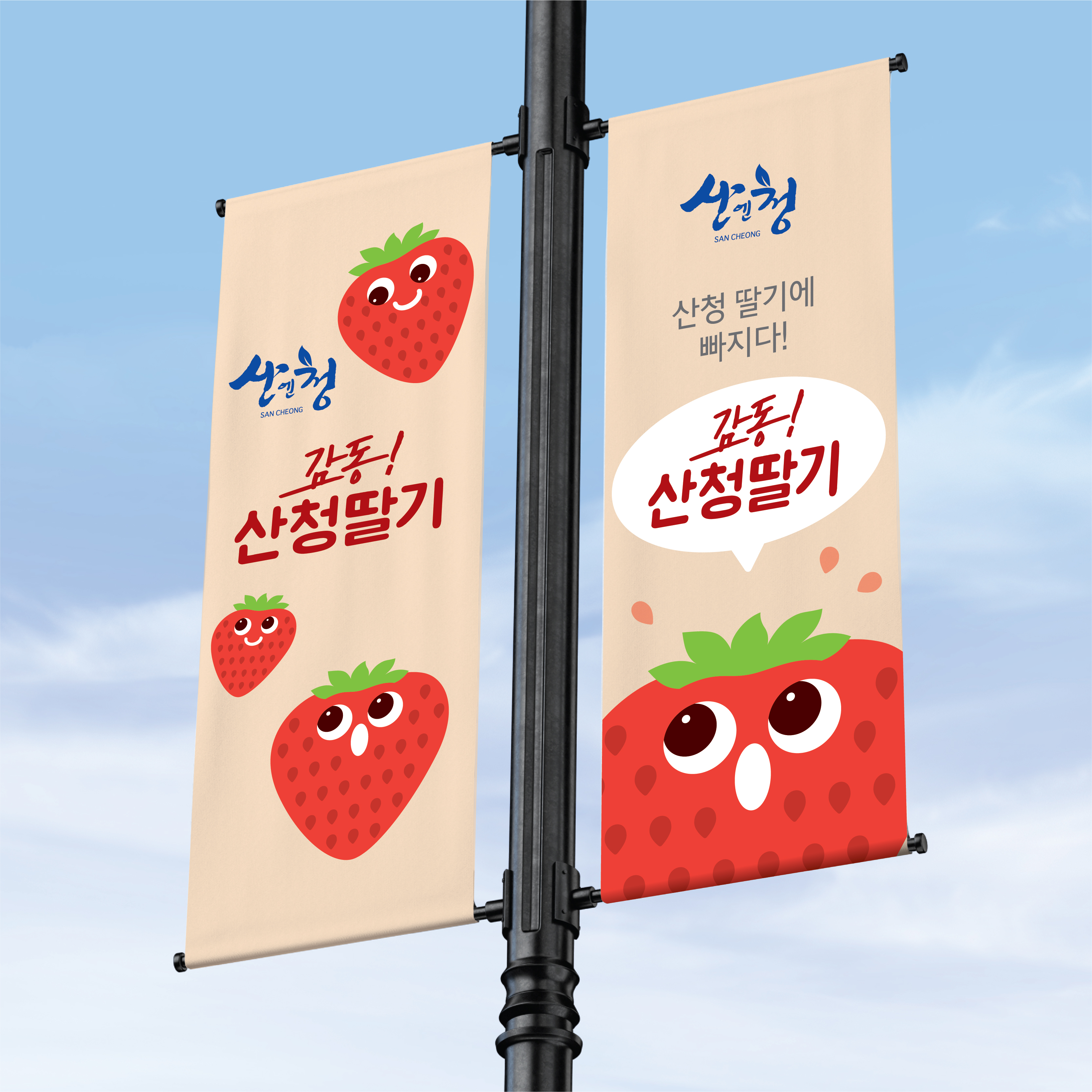 [산청의 자연과 산청딸기 맛에 감동하다]는 컨셉으로 놀란 표정이 강조된 딸기 캐릭터와 ‘감동!’이라는 캐츠프레이즈를 직접적으로 표현하여 친근하면서도 의미를 바로 전달할 수 있도록 디자인하였다.