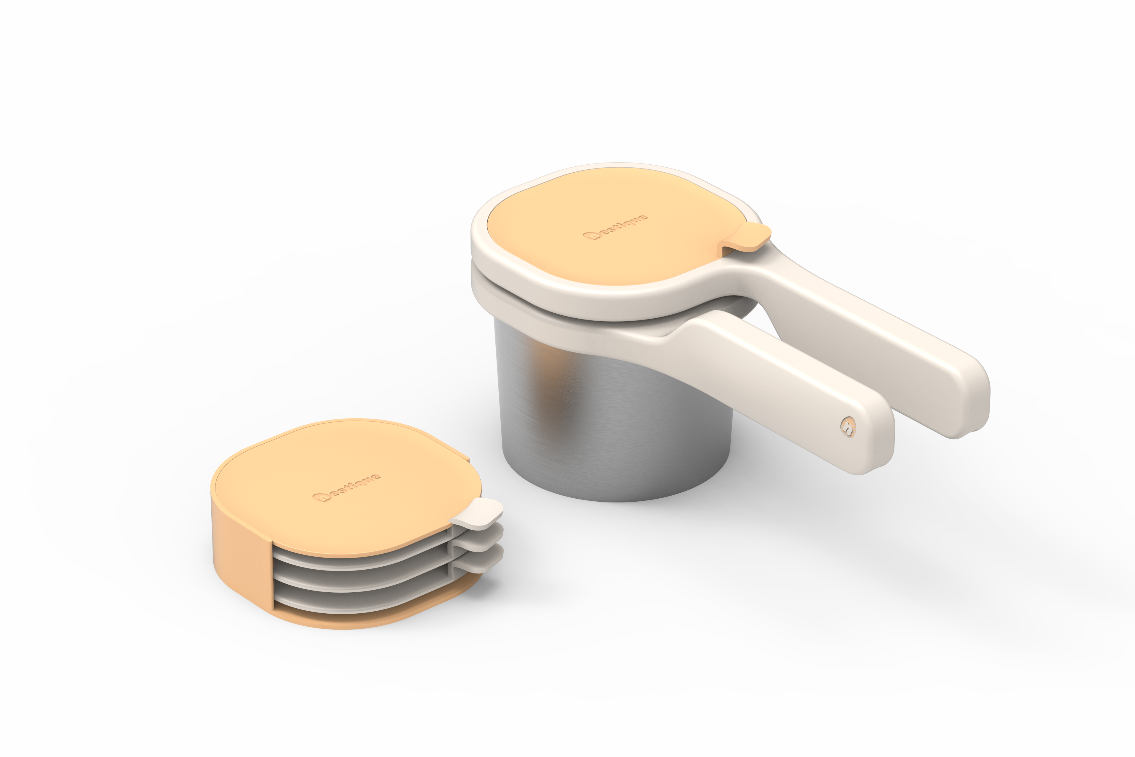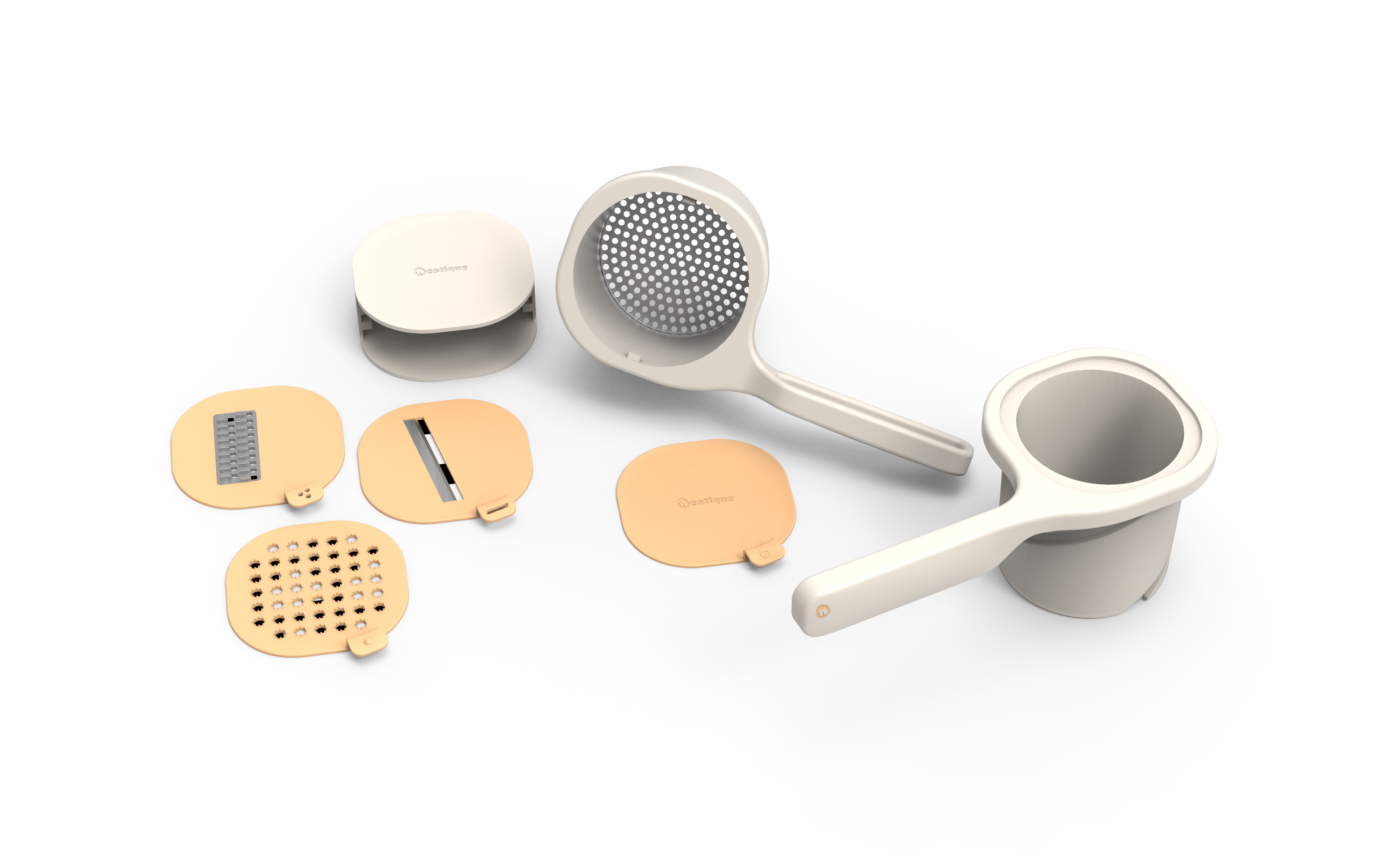 주방에서 손쉽게 프레스 하여 음식물을 다지거나 으껠수 있는 기능의 제품. 강판, 채칼 등 추가 구성 디자인