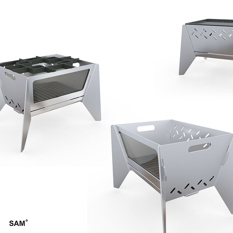 캠핑용 화로로 휴대가 용이하며 간단한 구조로 설치와 세척이 편리하도록 디자인함. 캠핑의 감성을 자극할 수 있는 디자인. 기존구조의 변화, 파츠의 최소화 인천디자인지원센터 2021 디자인개발지원, S등급