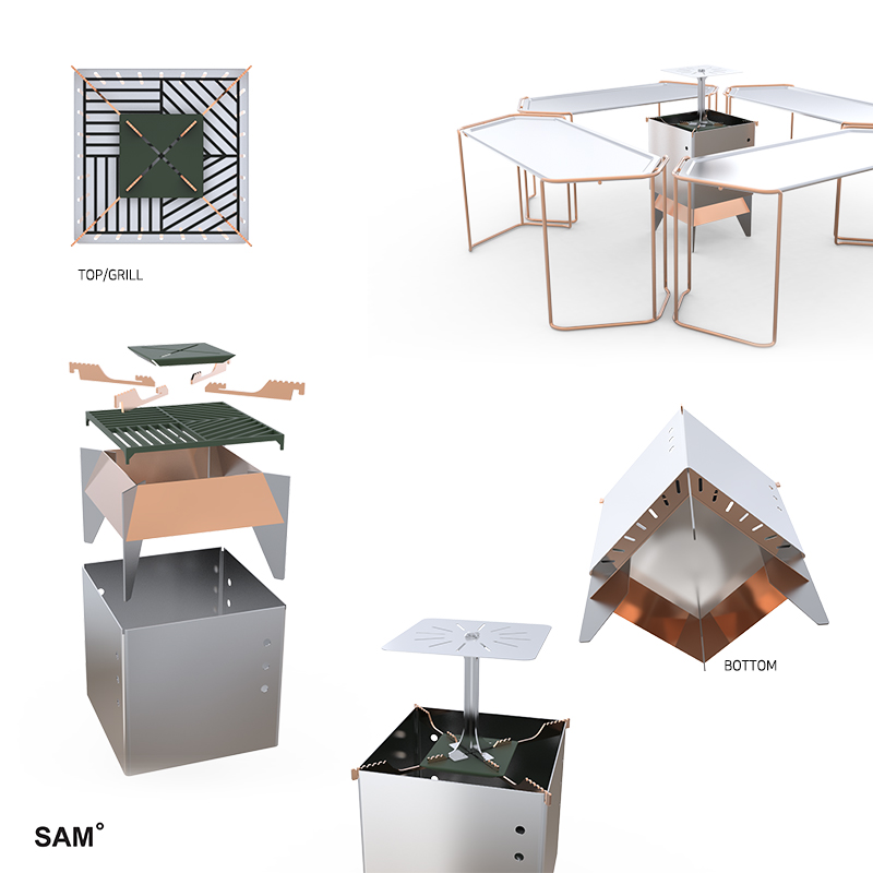 캠핑용 화로대와 테이블 디자인으로 화로는 요리에 따라 변형해 사용할 수 있도록 그릴, 냄비 고정 받침, 구이용 스탠드 등을 구성함. 화로 주변의 테이블은 상황과 인원수에 따라 변형하여 사용할 수 있도록 함.