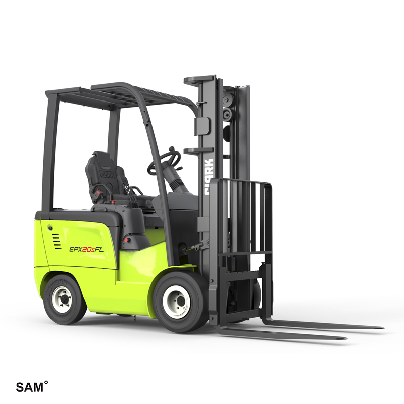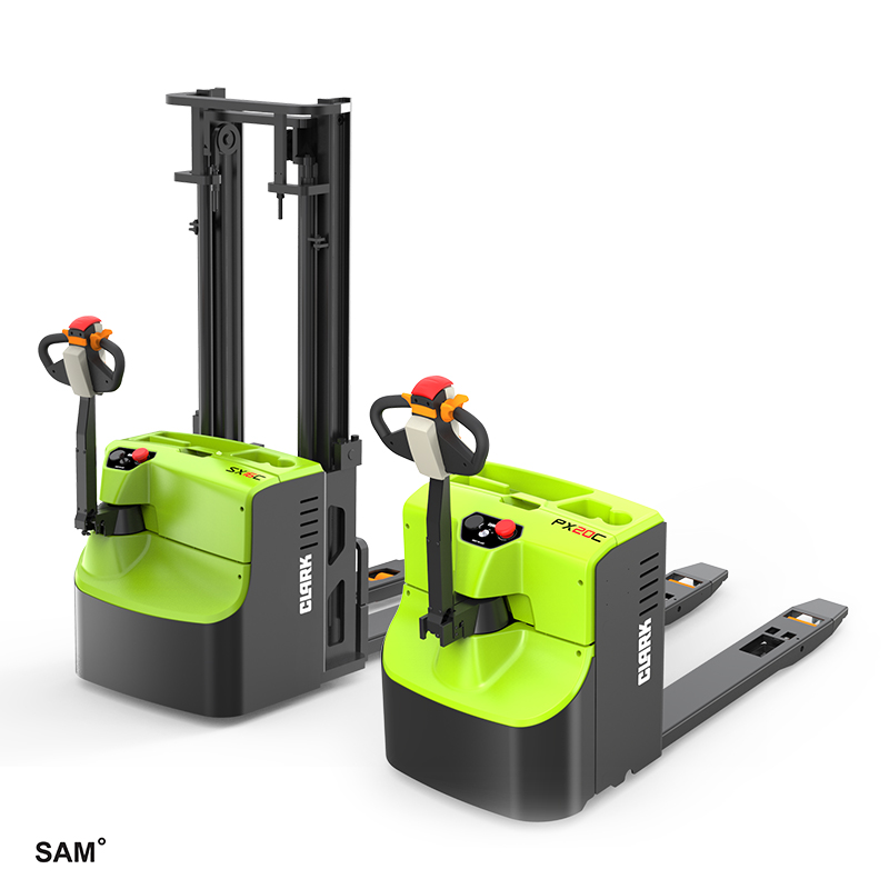 좌식엔진식지게차(S시리즈) 지게차 중 2~4톤모델을 기존 공용품을 사용하여 제품의 단가를 낮추고, 패밀리룩을 맞춘 디자인임. 입식전통지게차(FL), 보행식 전통 팔레트 디자인(PX C, SX C)