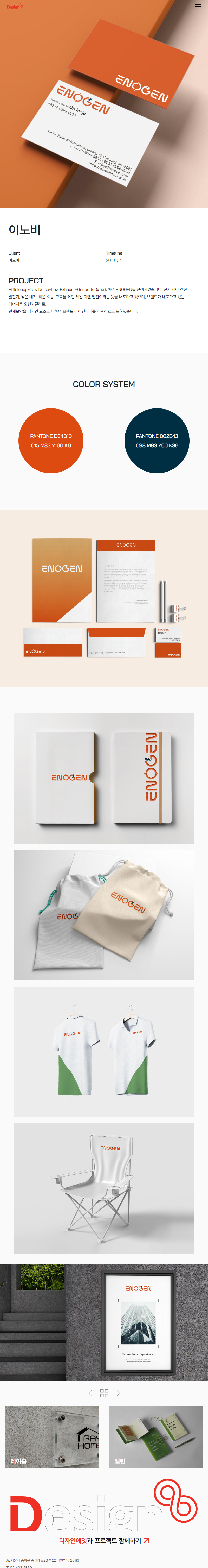 Efficiency+Low Noise+Low Exhaust+Generator을 조합하여 ENOGEN을 탄생시켰습니다. 에너지를 오렌지 컬러로 번개 모양으로 형상하여 디자인 요소를 더하여 브랜드 아이덴티티를 직관적으로 표현했습니다.