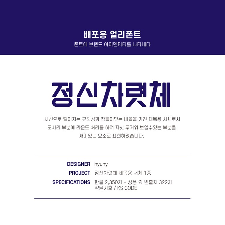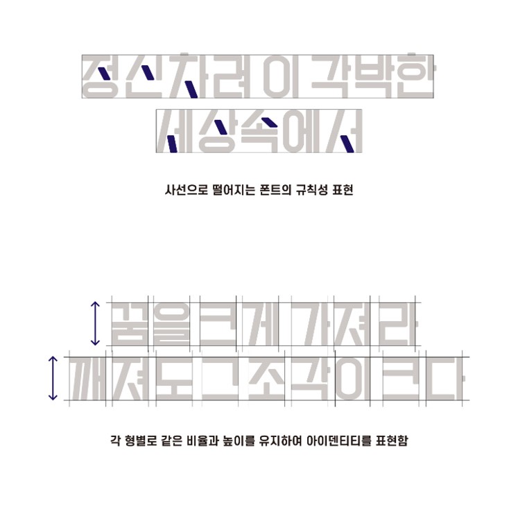 사선으로 떨어지는 규칙성과 딱 들어맞는 비율을 가진 제목용 서체로서 모서리 부분에 라운드 처리를 하여 자칫 무거워 보일수 있는 부분을 위트있게 표현하였습니다.