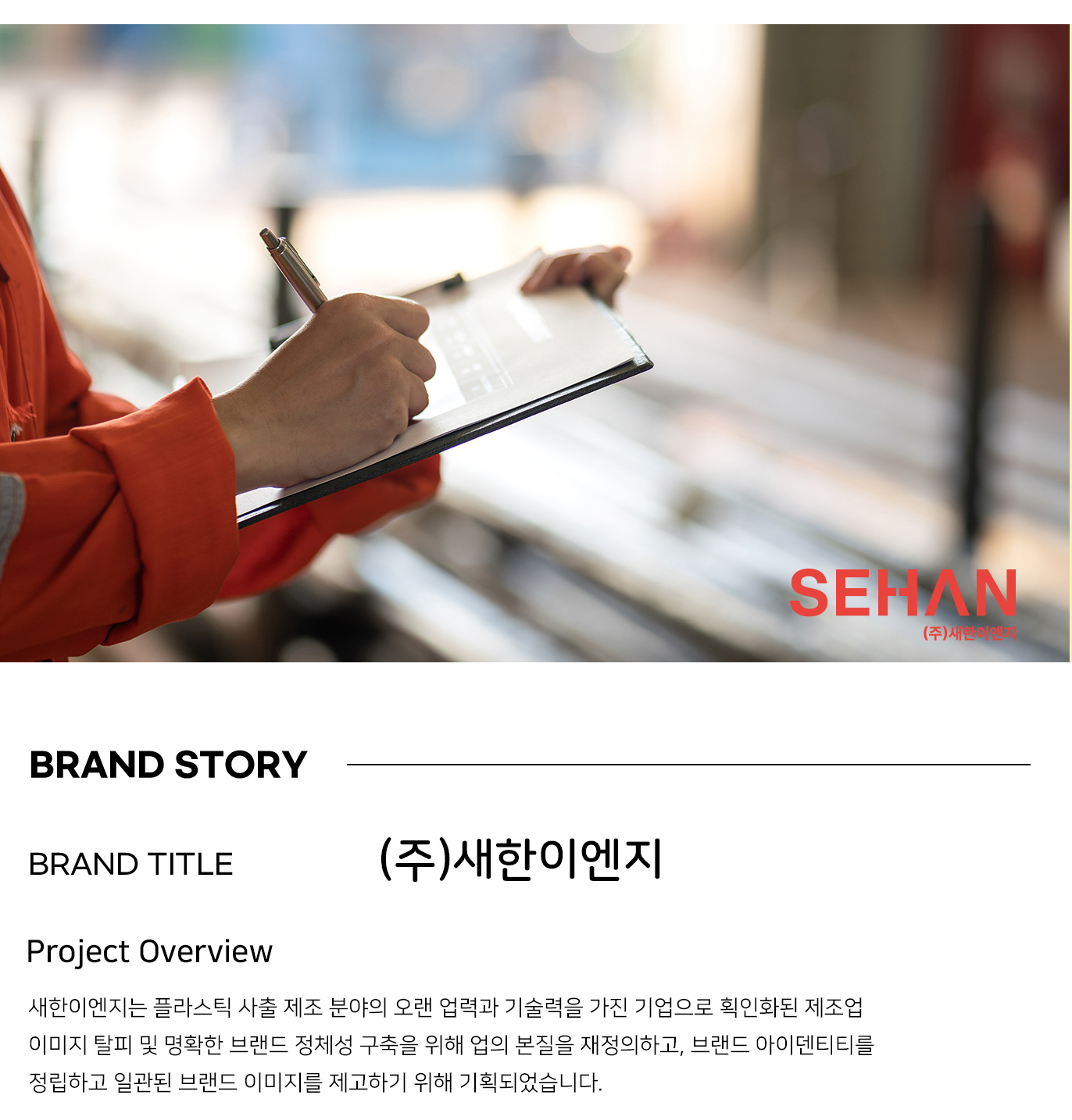 새한이엔지는 플라스틱 사출 제조 분야의 오랜 업력과 기술력을 가진 기업으로, 획인화된 제조업 이미지 탈피 및 명확한 브랜드 정체성 구축을 위해 업의 본질을 재정의 및 이미지 제고를 위한 기획을 하였습니다.