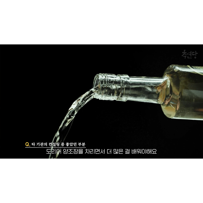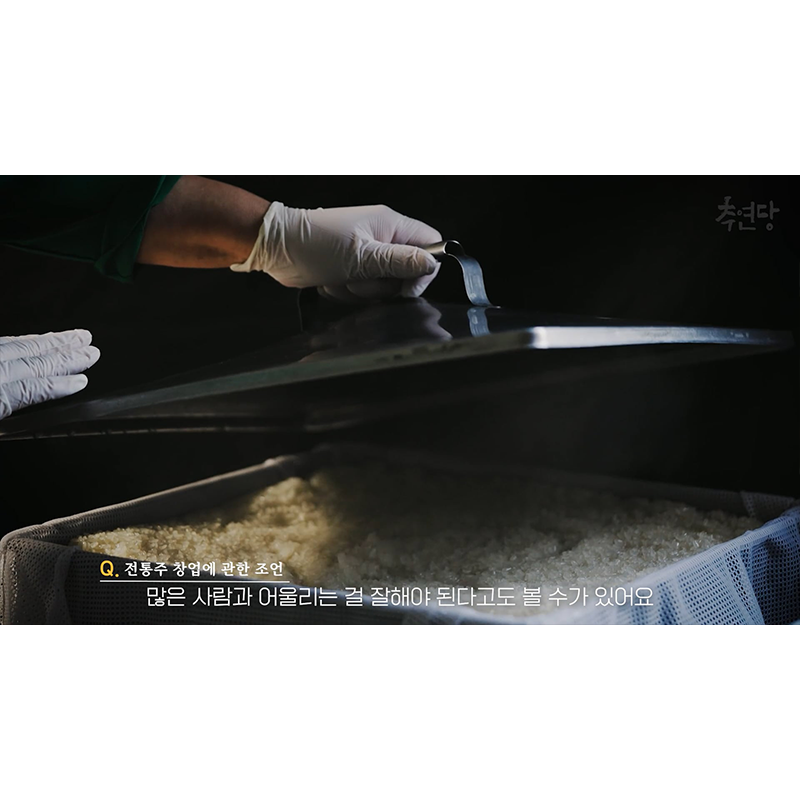 국립농산물품질관리원 전통주 창업 성공 사례 홍보영상으로, '추연당'의 창업 이야기를 따뜻하고 진지한 분위기로 표현함. 감각적인 영상미와 세련된 그래픽을 통해 신뢰감을 전달함.