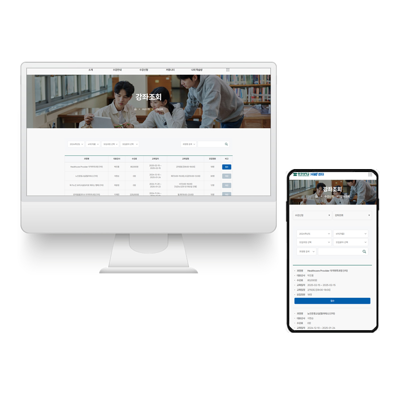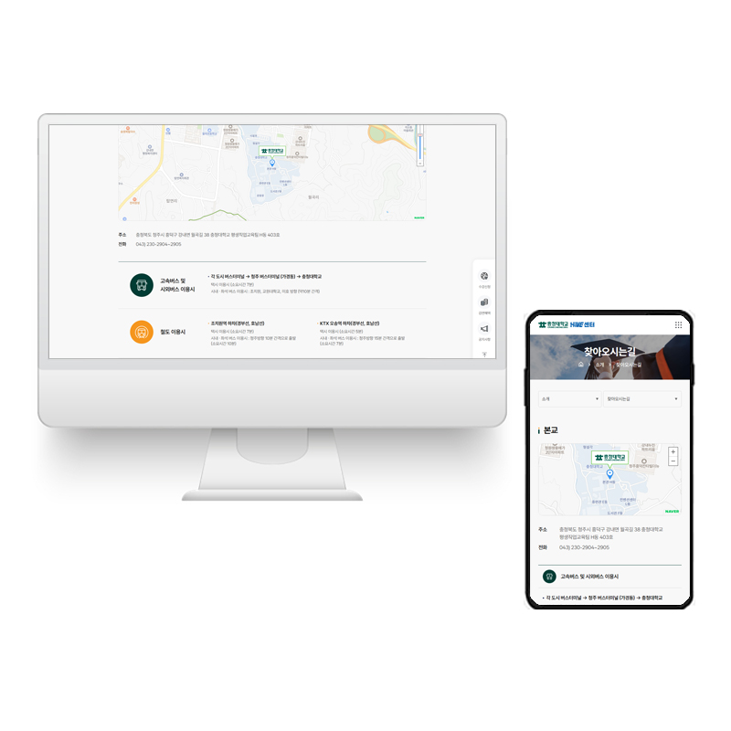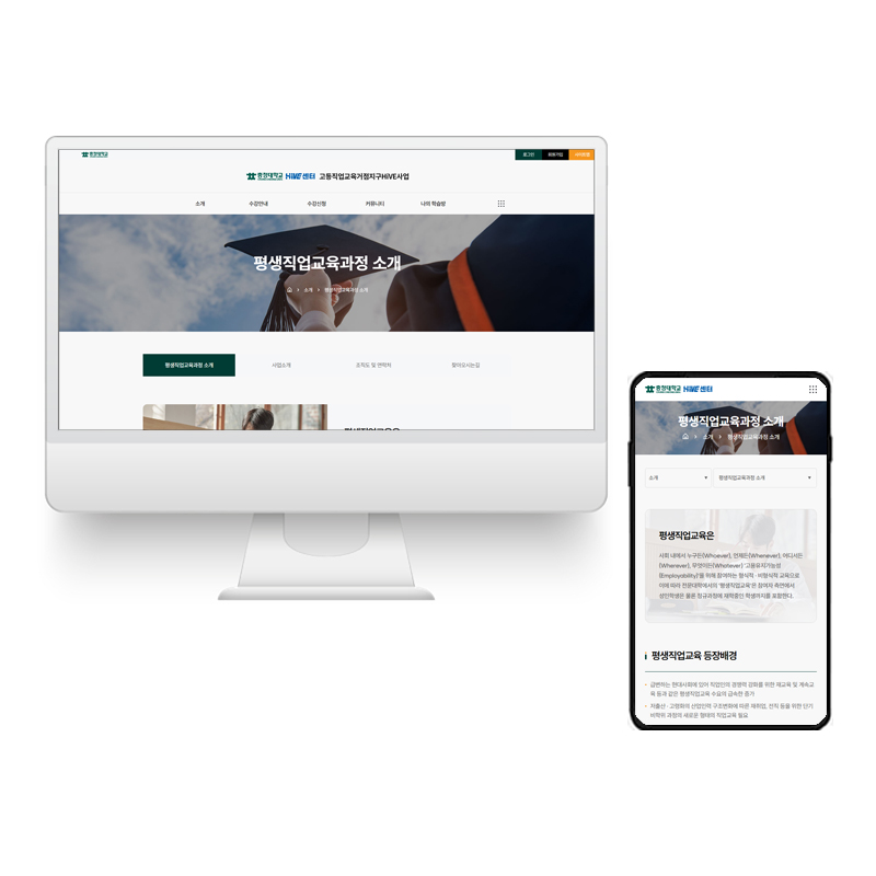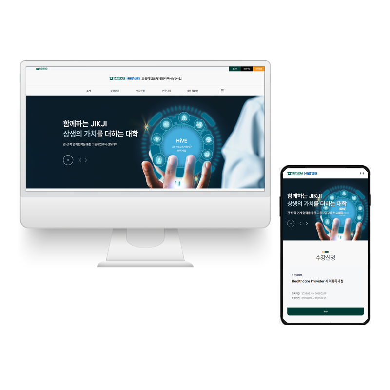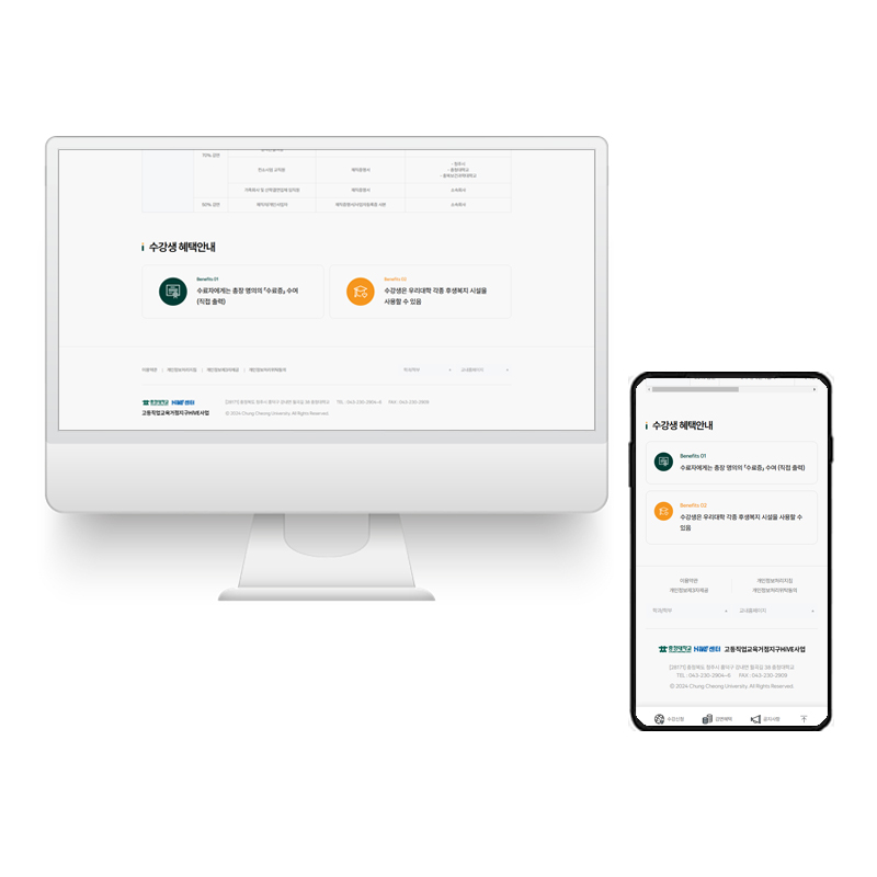 평생교육센터의 목적에 알맞도록 사용자 친화적인 UI/UX를 적용하여 사용성을 극대화 시키고 충청대학교 자체를 나타낼 수 있는 컬러와 메뉴 구조를 제안하여 성공적인 디자인을 적용한 홈페이지를 제작 하였습니다.