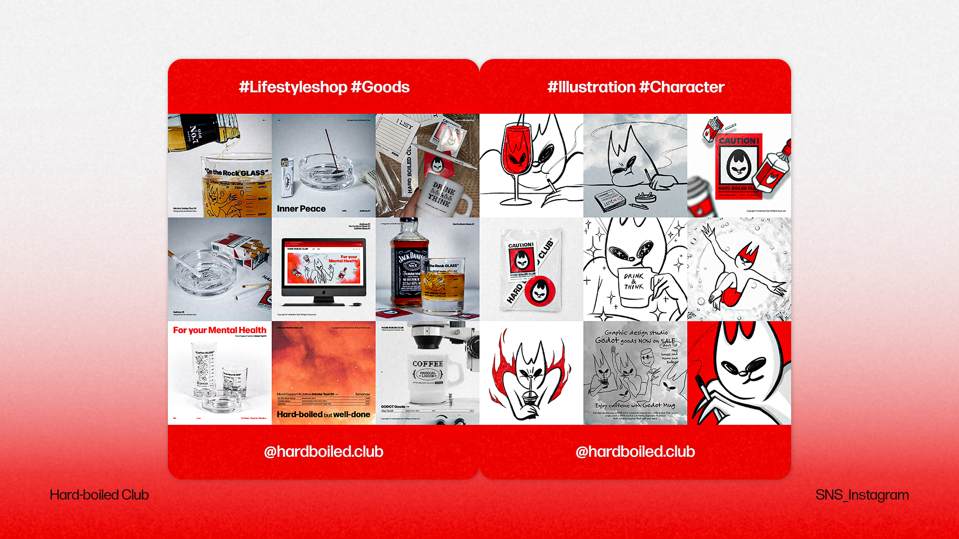 라이프스타일 브랜드 하드보일드클럽을 위한 BX 전반을 디자인하였습니다. 30대 남성을 타겟으로 한 브랜드로 익살스러운 캐릭터와 그래픽을 통해 마케팅 에셋을 구축하였습니다.