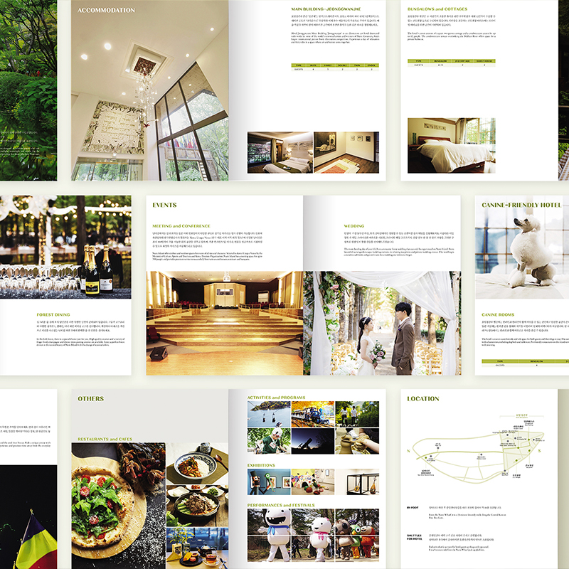 남이섬 내 위치한 호텔정관루 홍보를 위한 호텔 안내 책자를 디자인 및 제작했습니다. 계절의 변화를 오롯이 느낄 수 있는 위치적 특성을 산뜻한 컬러로 표현하였습니다.