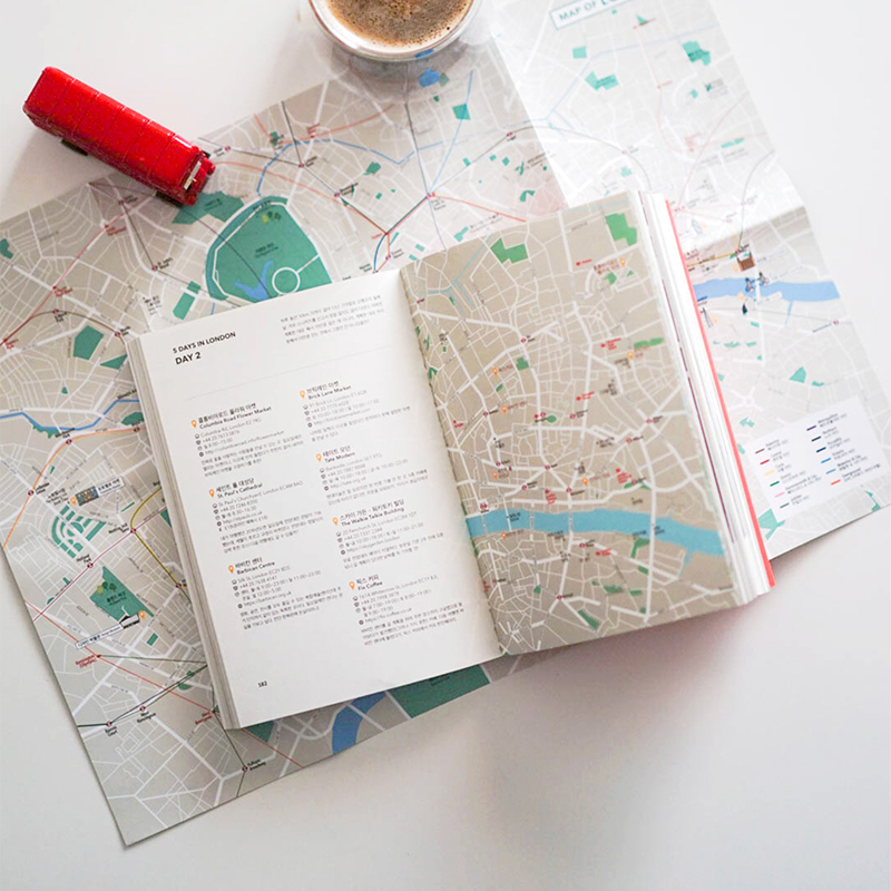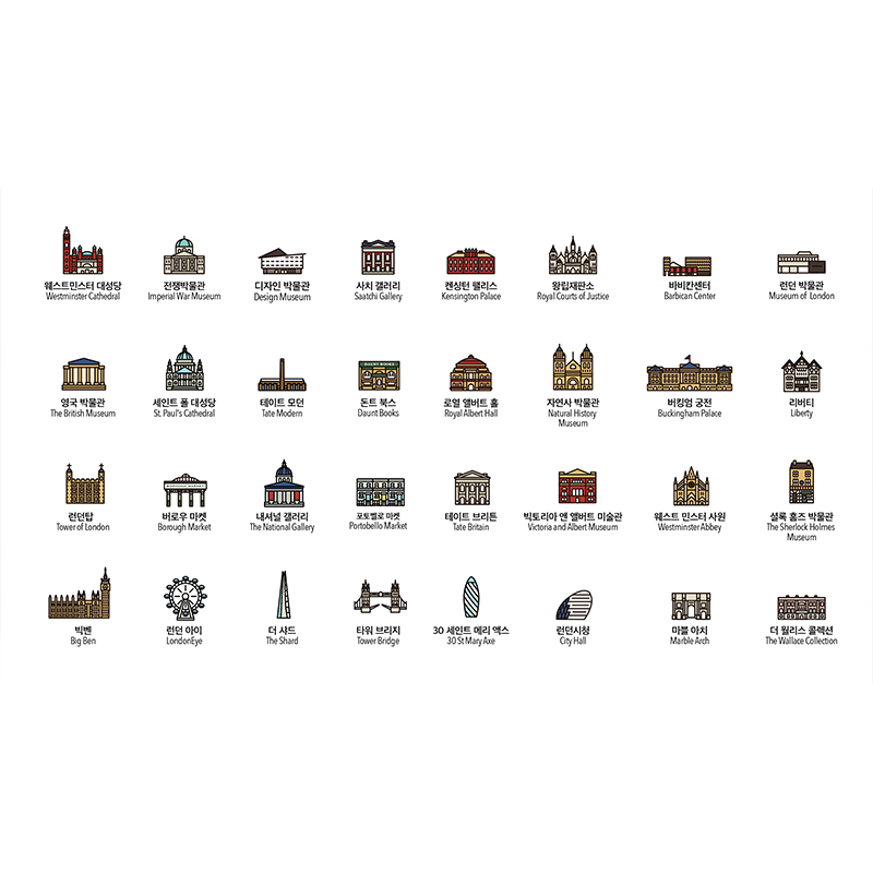 런던의 명소 32곳이 지도에서 한눈에 들어올 수 있도록 아이콘 및 지도 그래픽을 디자인했습니다. 「언제 가도 좋을 여행, 유럽」 책에 삽입되어 있으며, 이를 활용한 굿즈(스티커와 지도)를 제작 진행했습니다.
