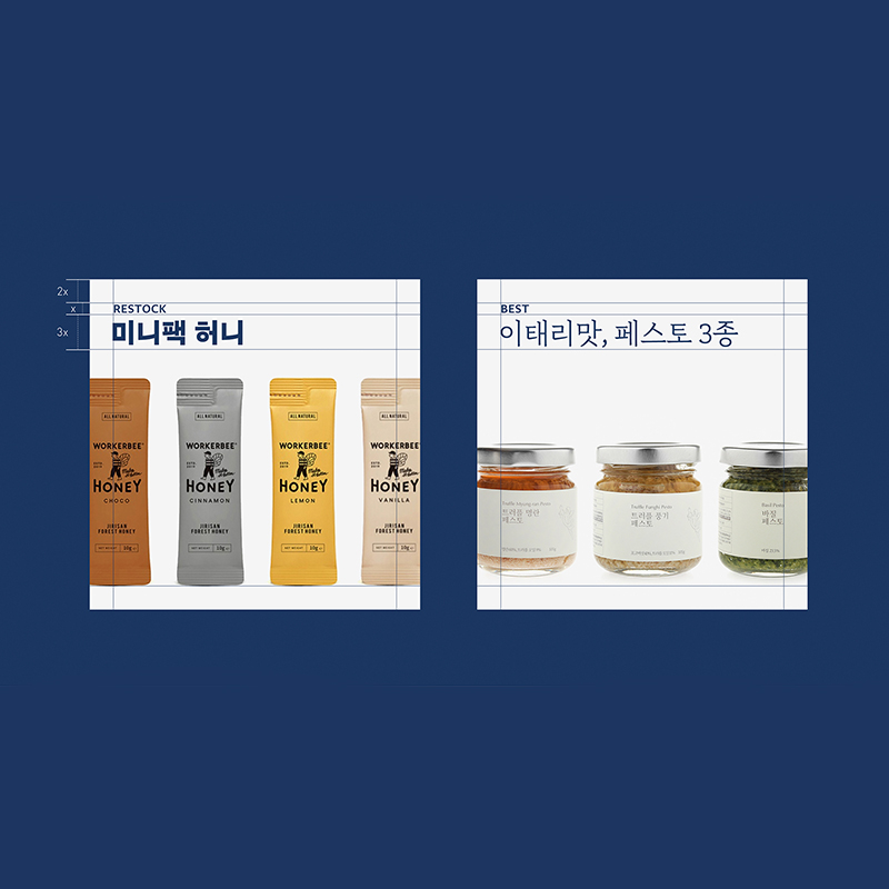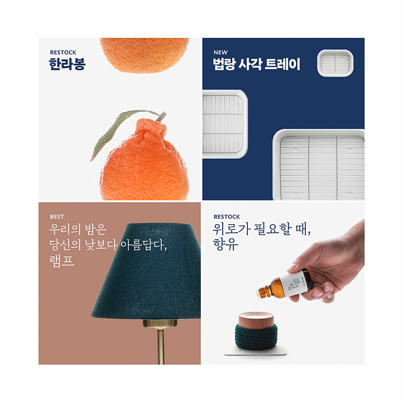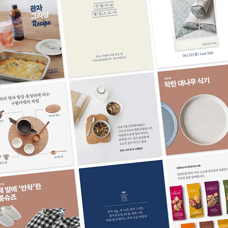 2021~2022 온라인 플랫폼 '구월마켓'의 인스타그램 콘텐츠 디자인을 년간 진행했습니다. 구월마켓의 메인 컬러에 맞춰 매일 업로드되는 다양한 상품들의 특징을 잘 드러낼 수 있도록 하는데 중점을 두었습니다.