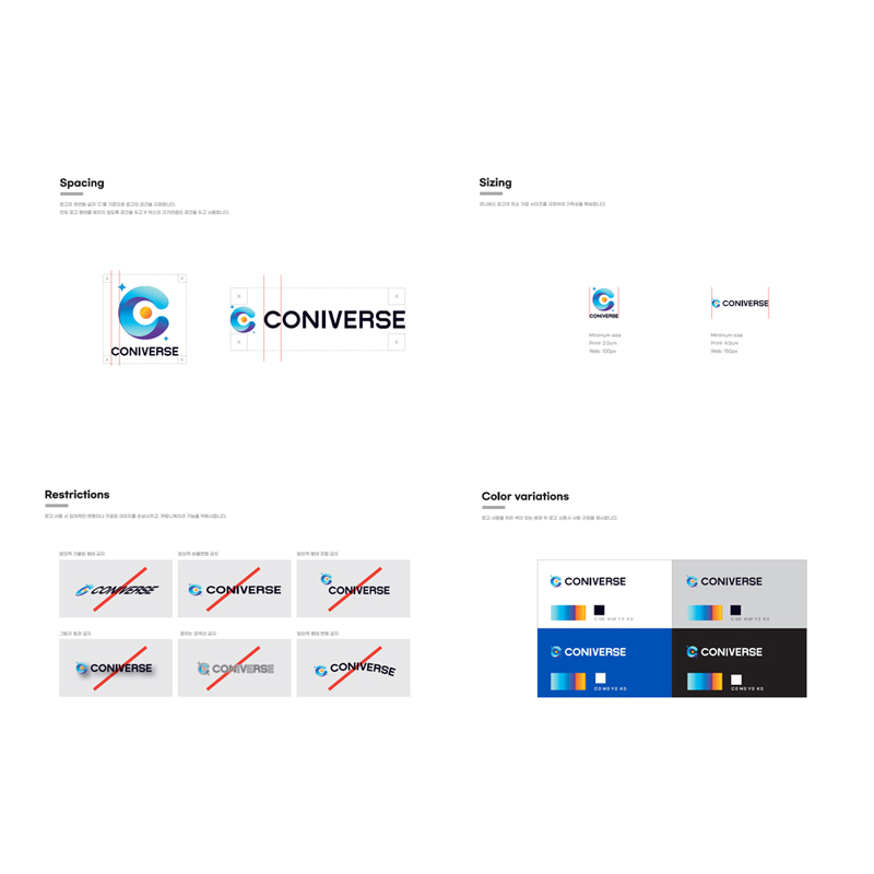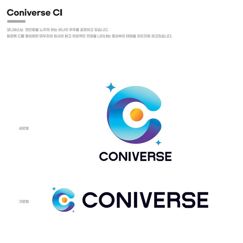 유통전문사 코니버스의 CI개발 작업을 진행하였습니다. 코니버스라는 하나의 세계관을 가진 기업의미를 반영해 띠를 가진 행상을 상징하는 심볼을 그라데이션을 주어 단단하고 깔끔한 느낌으로 개발하였습니다.