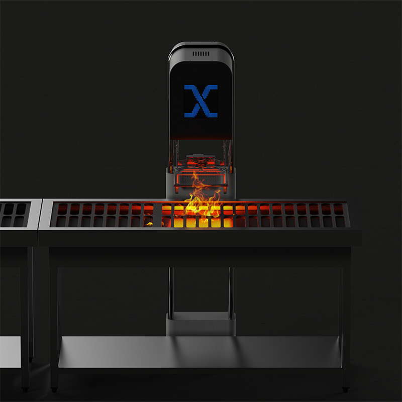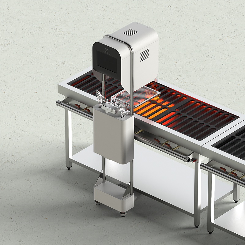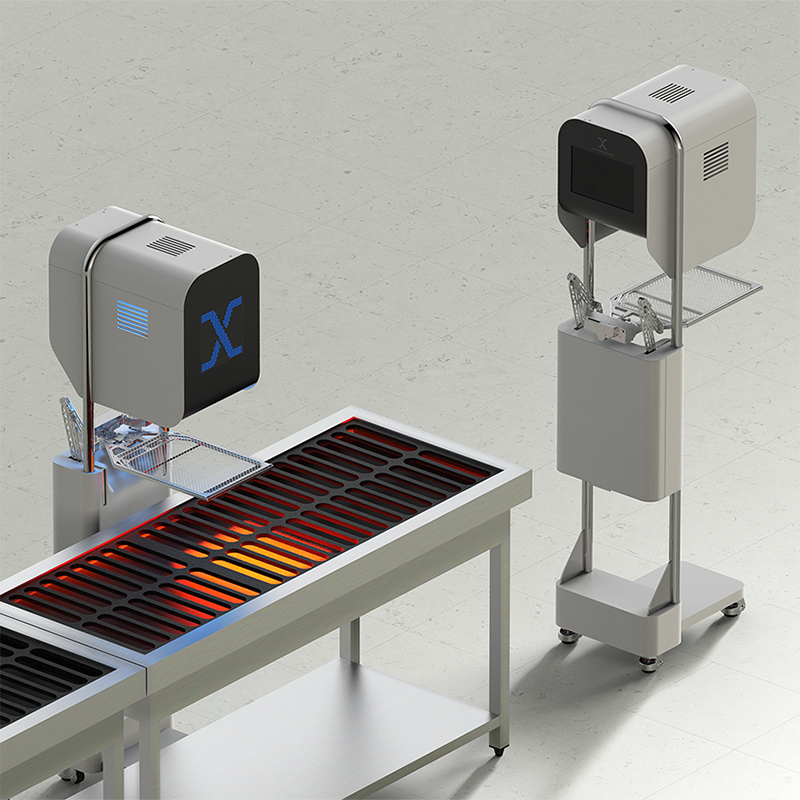 비욘드허니컴 인공지능 그릴 로봇 GRILL-X. 사용자 경험을 분석하여 부품 모듈을 원형 파이프로 연결되는 형태로 디자인하여 사용편의성과 함께 제작과 조립, 유지보수 편의성도 함께 향상시켰습니다.