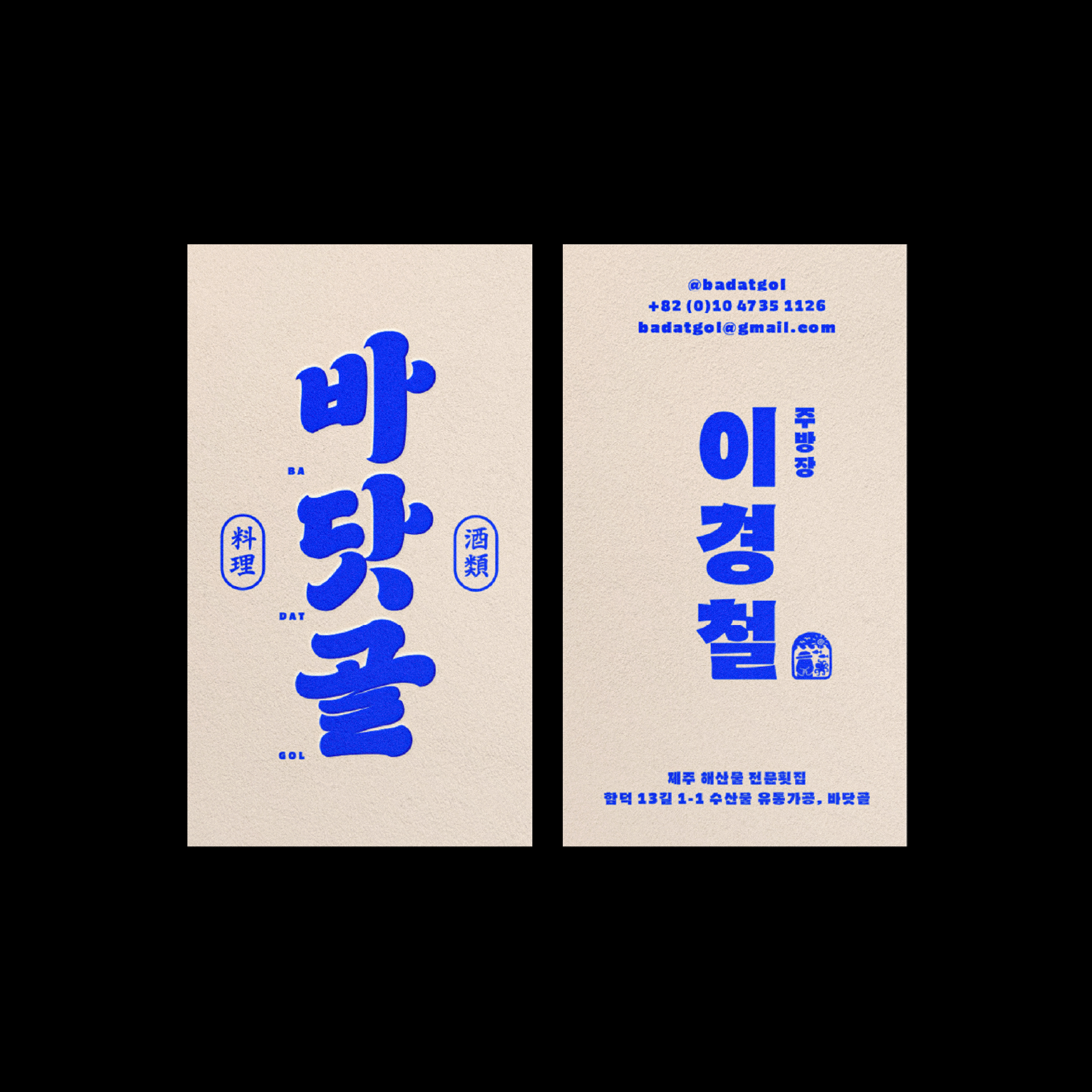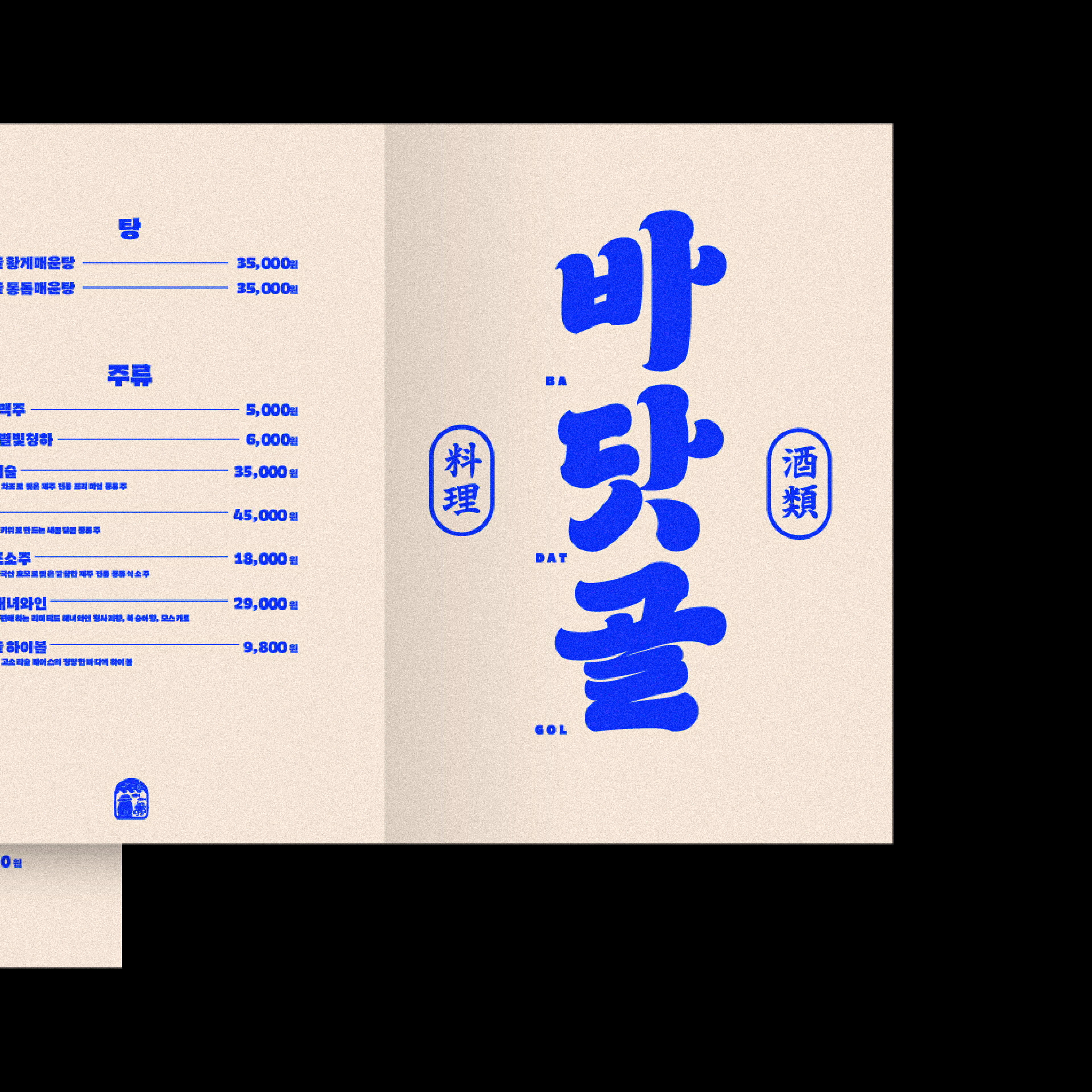 스튜디오두꺼비는 ‘바닷골’의 아이덴티티에 제주 고유의 헤리티지를 담았습니다. 파도와 해산물에서 영감을 얻은 한글 레터링으로 바닷마을의 정취를 표현하고, 돌하르방 심볼로 지역적 독창성을 강조했습니다.