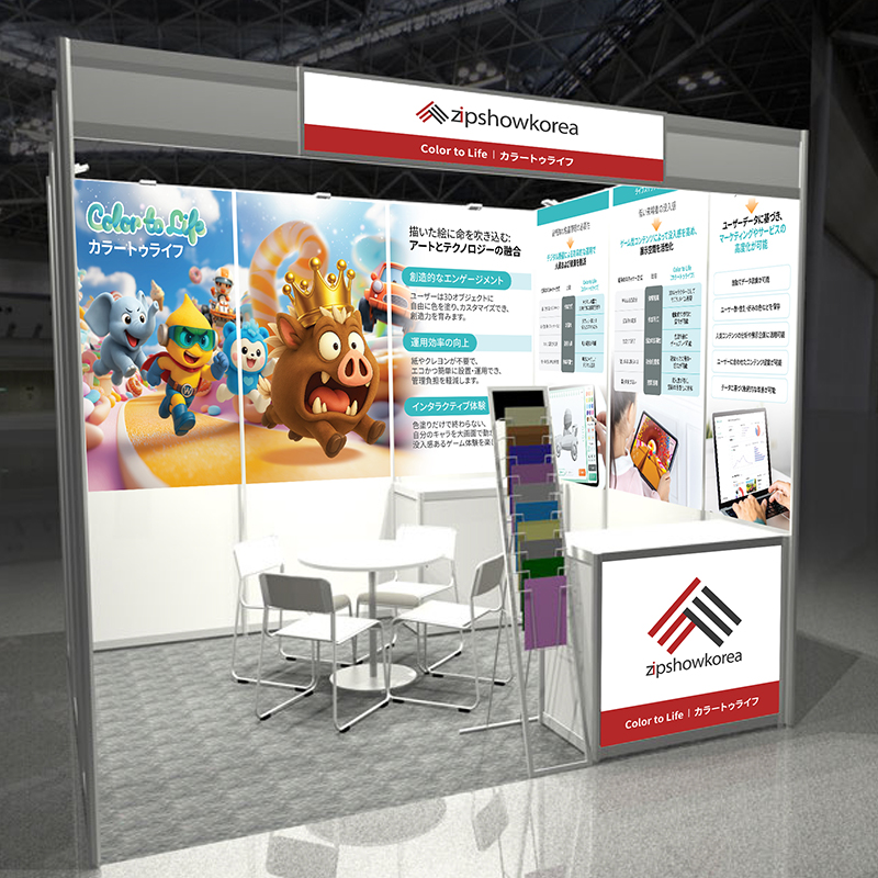 일본 박람회 홍보를 위해 Color to Life 전용 족자봉 배너를 기획·제작하였습니다. 생동감 있는 캐릭터와 직관적인 메시지를 통해 현지 관람객이 쉽게 이해하고 몰입할 수 있도록 디자인하였습니다