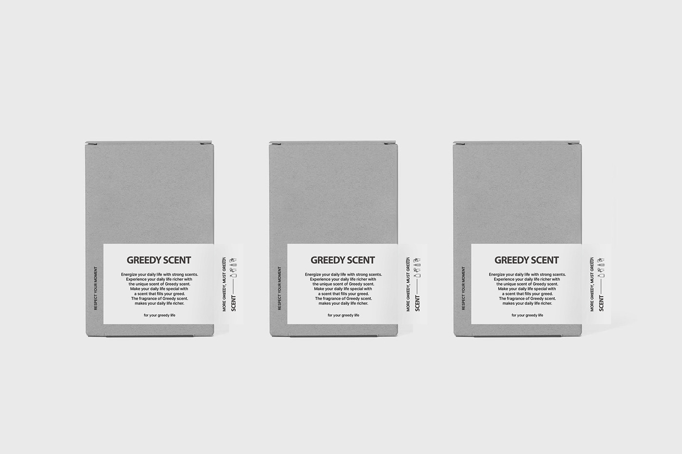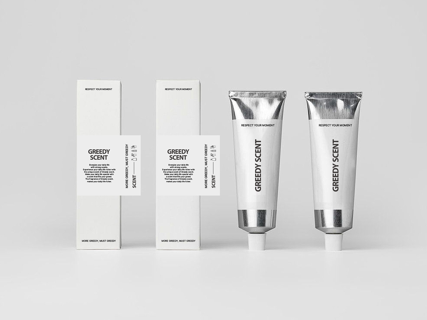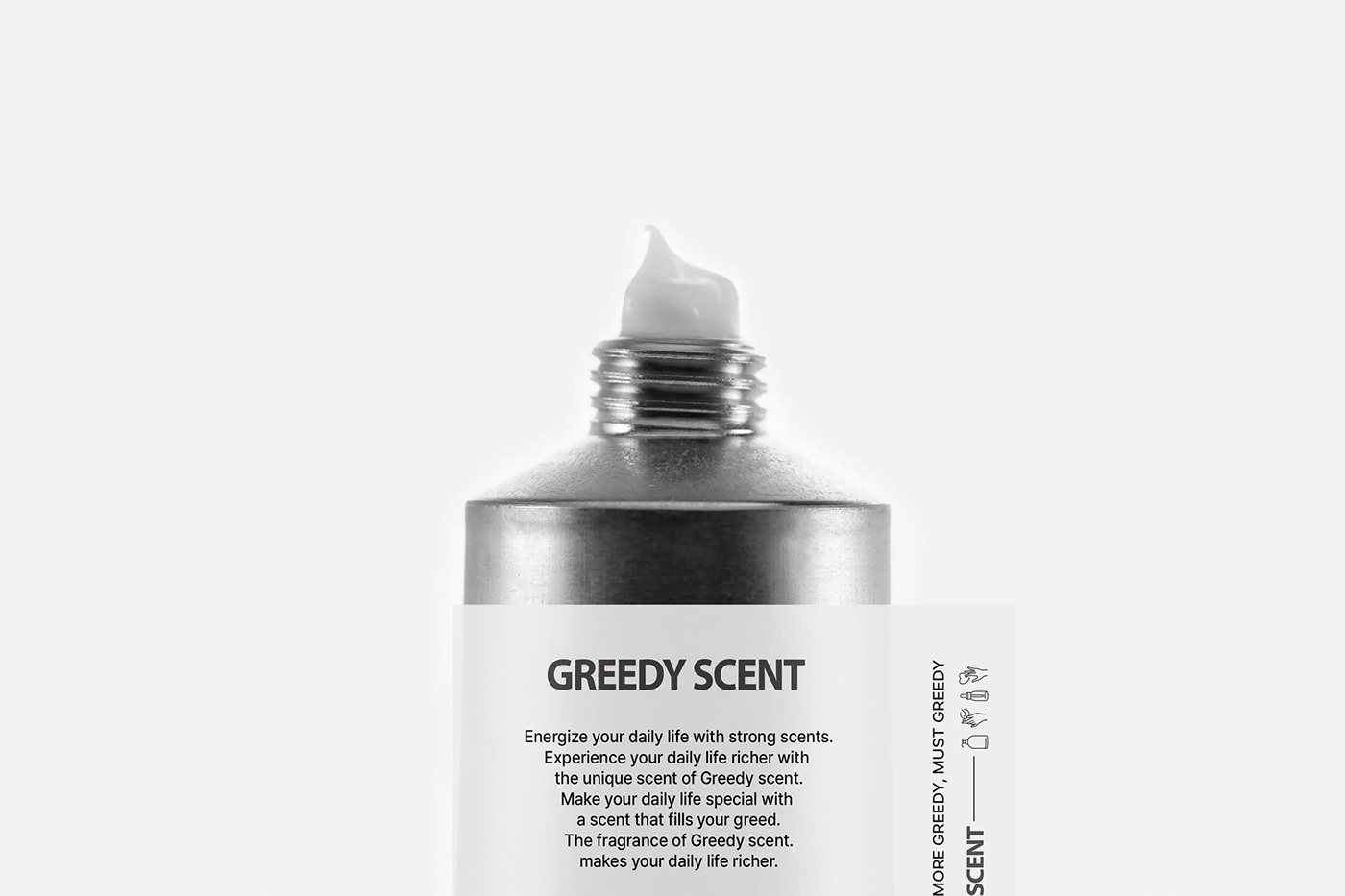 GREEDY SCENT는 미니멀한 패키지와 정제된 그래픽으로 브랜드의 감각적인 아이덴티티를 표현한 화장품이다. 화이트와 메탈 톤의 절제된 디자인으로 본질과 향에 집중하도록 설계되었다.