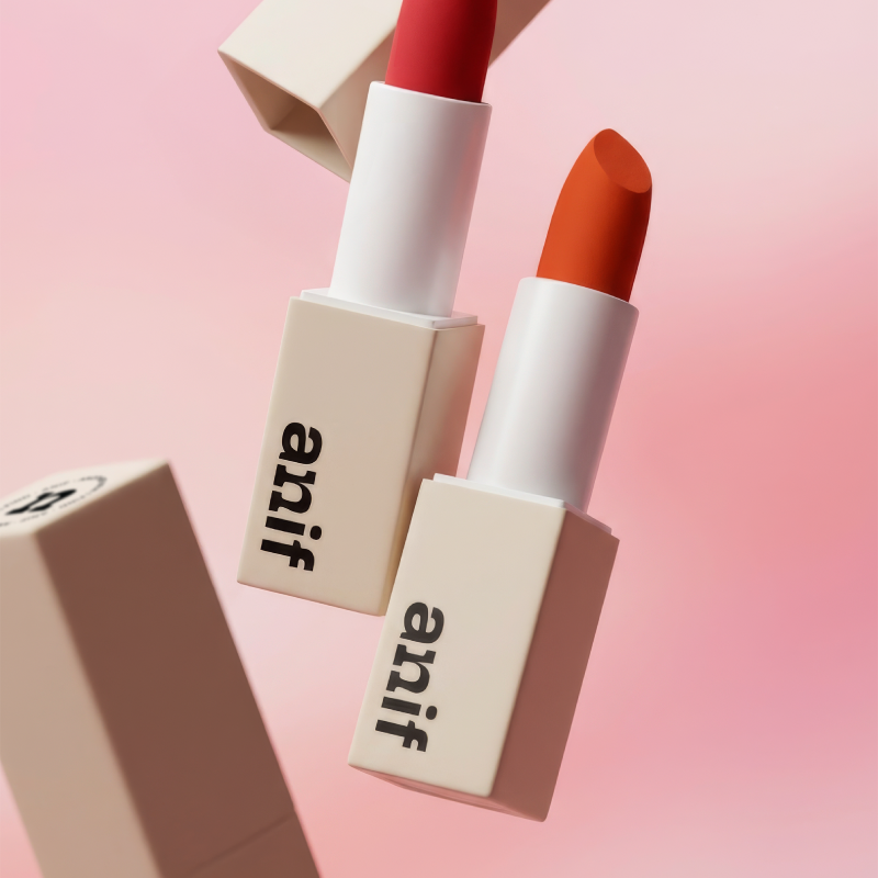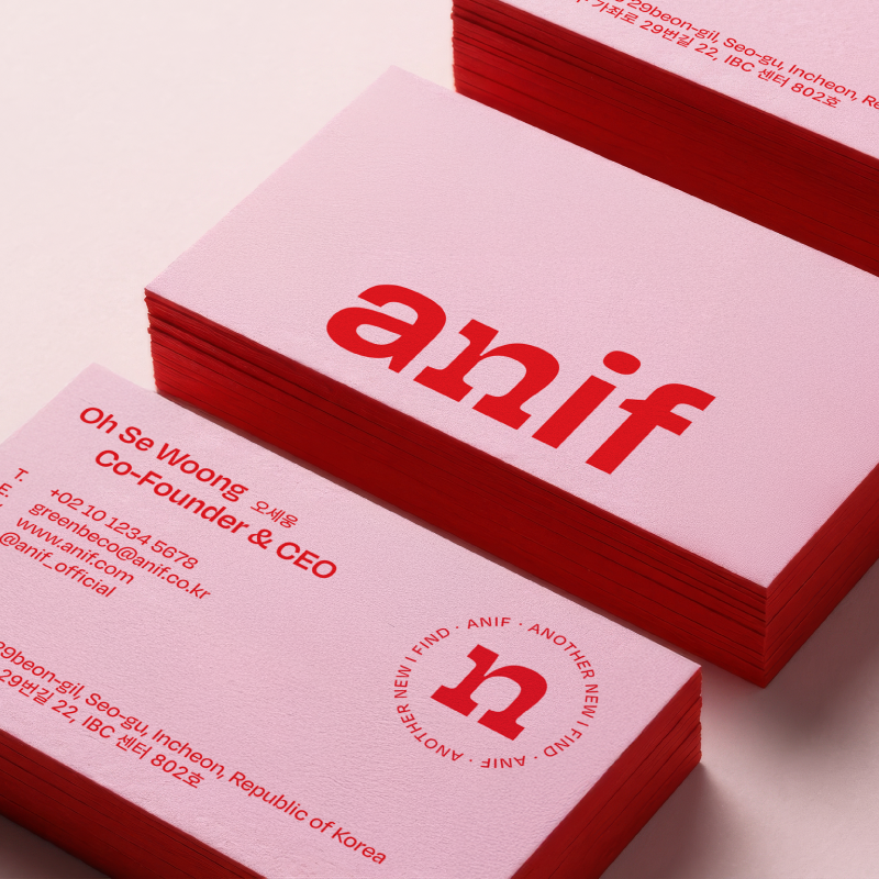 어니프는 'Another New I Find' 슬로건을 담아 'n'에만 슬랩 세리프를 적용해 새로움 발견을 강조했습니다. 레드·핑크 대비로 MZ세대의 자신감과 실험적 뷰티를 표현한 K-뷰티 브랜드입니다.
