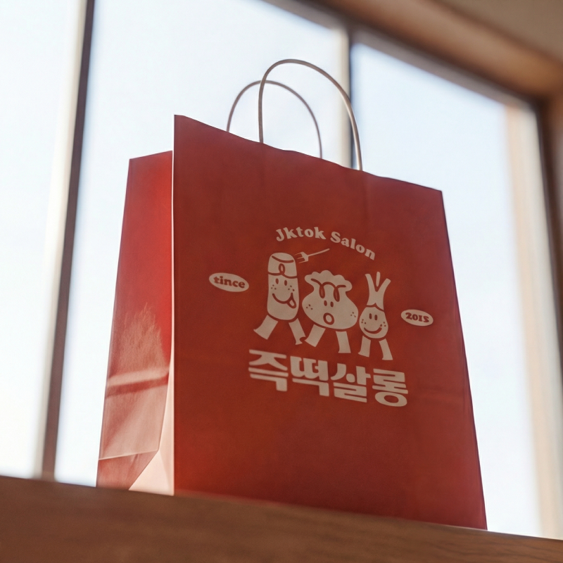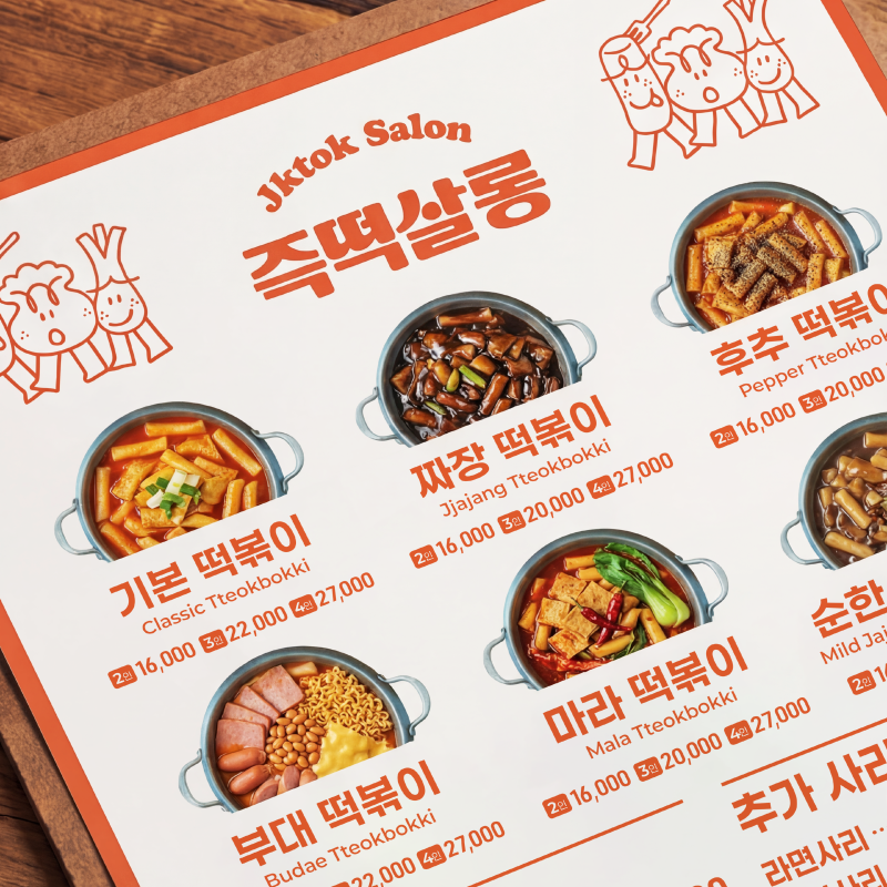 쯕떡살롱은 떡·배추·대파를 의인화한 위트 있는 캐릭터로 신선함과 MZ세대의 펀한 감성을 담았습니다. 오렌지 컬러와 손그림 레트로 타이포로 분식집 향수와 트렌디함을 조화롭게 완성했습니다.