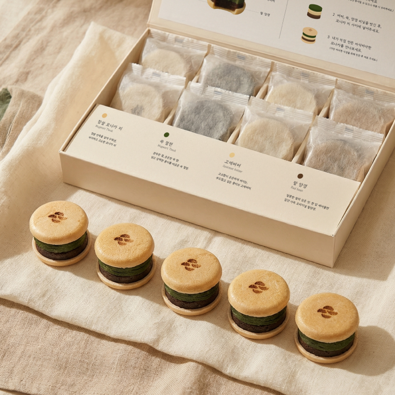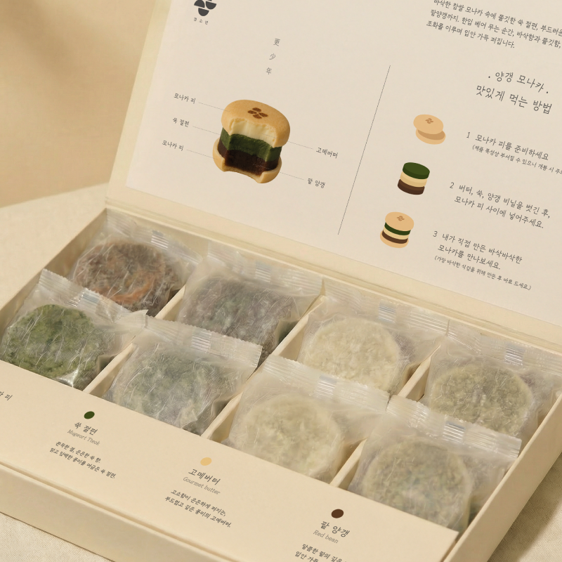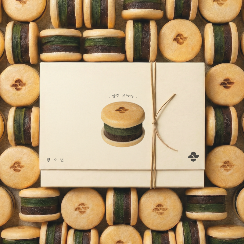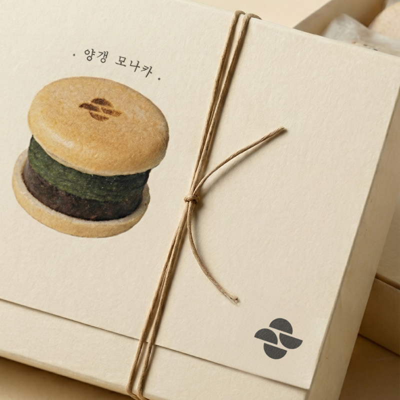 양갱 모나카를 현대적으로 재해석해 미니멀 베이지 톤과 여백으로 한국적 정갈함과 모던함을 구현했습니다. 심플 타이포, 질감과 끈 장식으로 수제 디저트의 프리미엄 가치와 정성스러운 경험을 전달합니다.