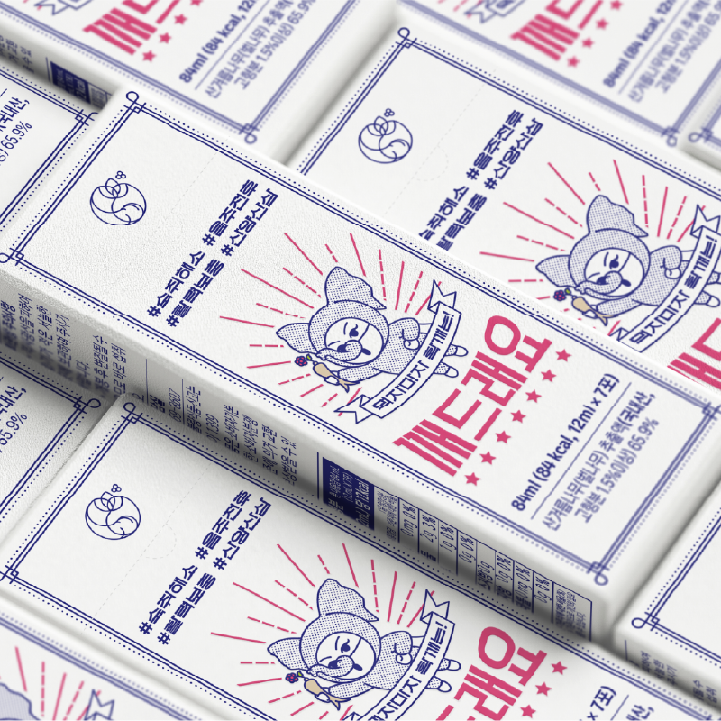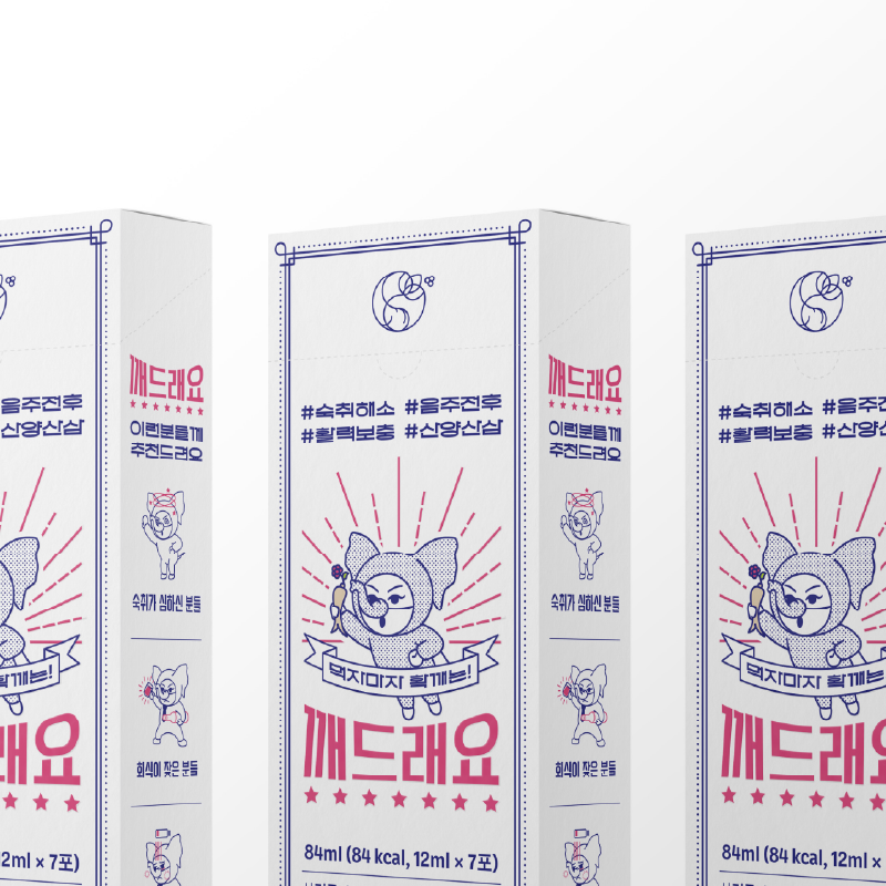 레트로 컬러로 경쾌하고 신뢰감 있는 뉴트로 콘셉트의 숙취해소제 패키지입니다. 도트 패턴 코끼리 마스코트와 방사형 집중선, 리본 배너 등 빈티지 만화 스타일로 즉각적 효능을 유쾌하게 표현했습니다.