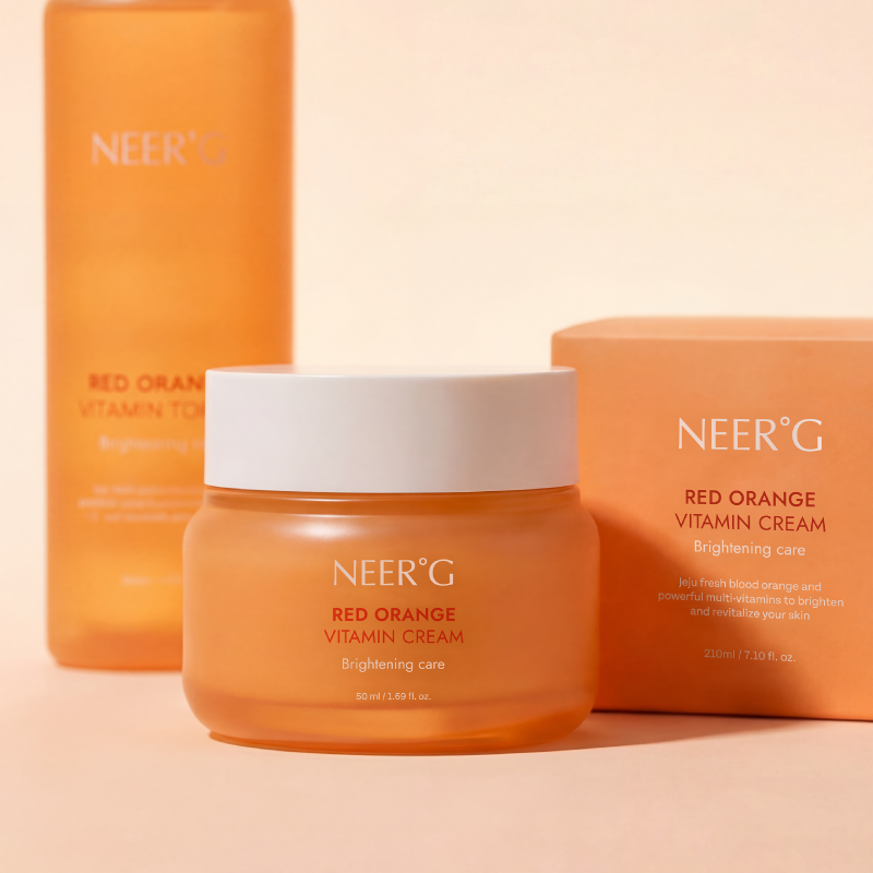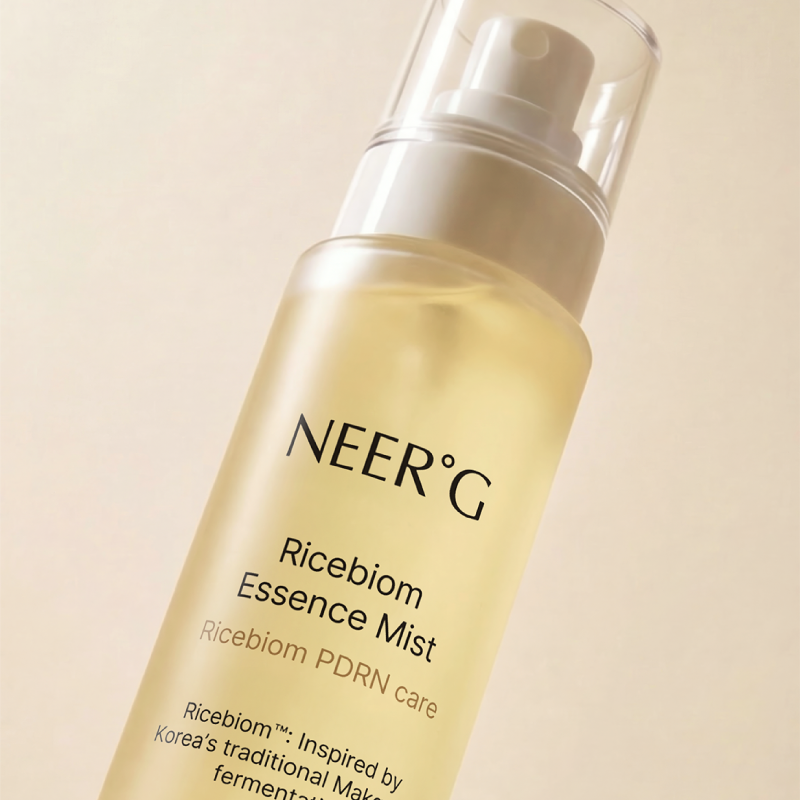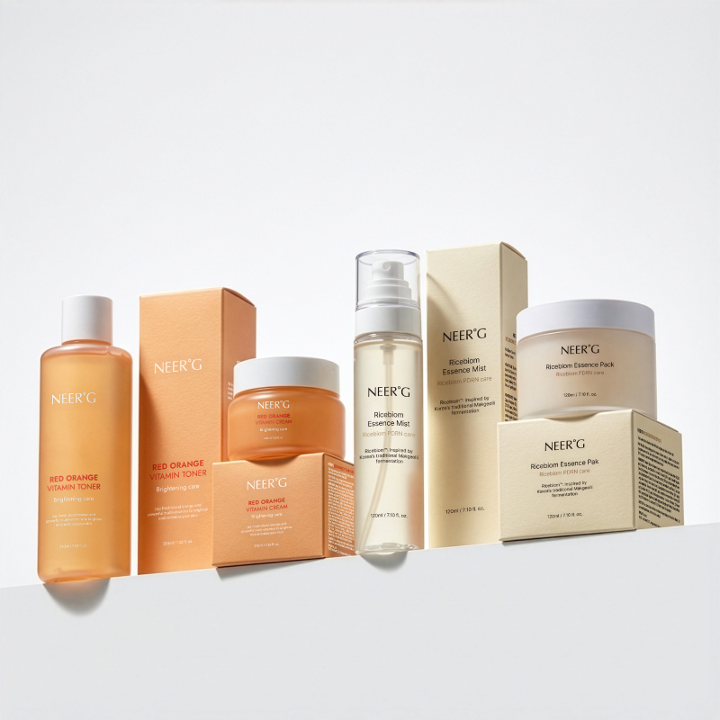 니얼지는 비타민과 라이스바이옴 라인을 컬러로 구분해 핵심 성분을 명확히 전달합니다. 미니멀 타이포와 반투명 용기로 제품 본연의 색을 보여주며, 과학적 신뢰성을 강조한 현대적 K-뷰티 브랜드를 완성했습니다.