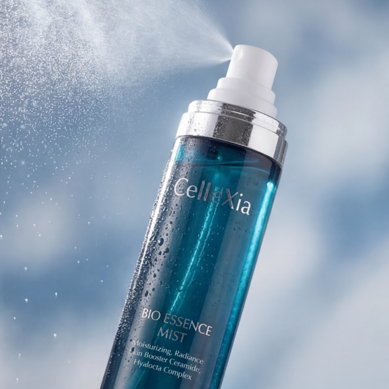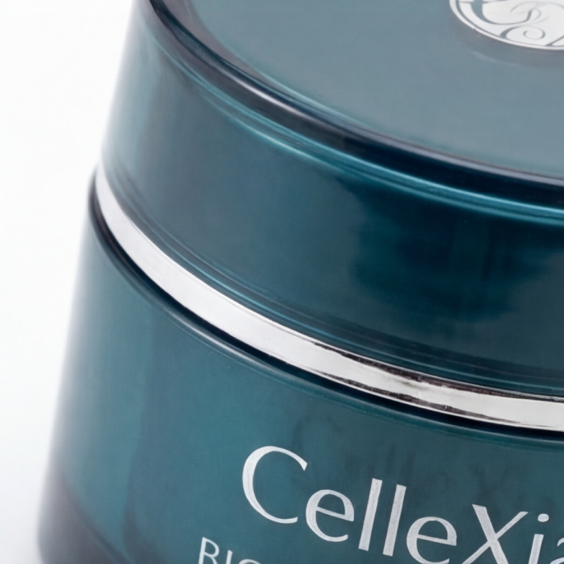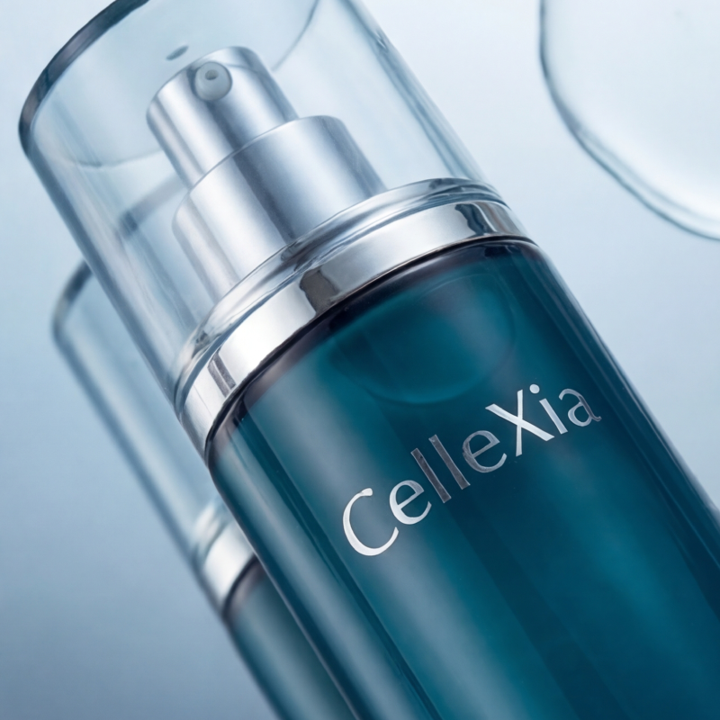 딥 틸 컬러를 시그니처로 한 바이오 더마 코스메틱 브랜드입니다. 원형 심볼의 유기적 곡선으로 세포 재생을 상징하고, 투명 용기와 메탈릭 실버로 수분감과 첨단 기술력을 표현했습니다.