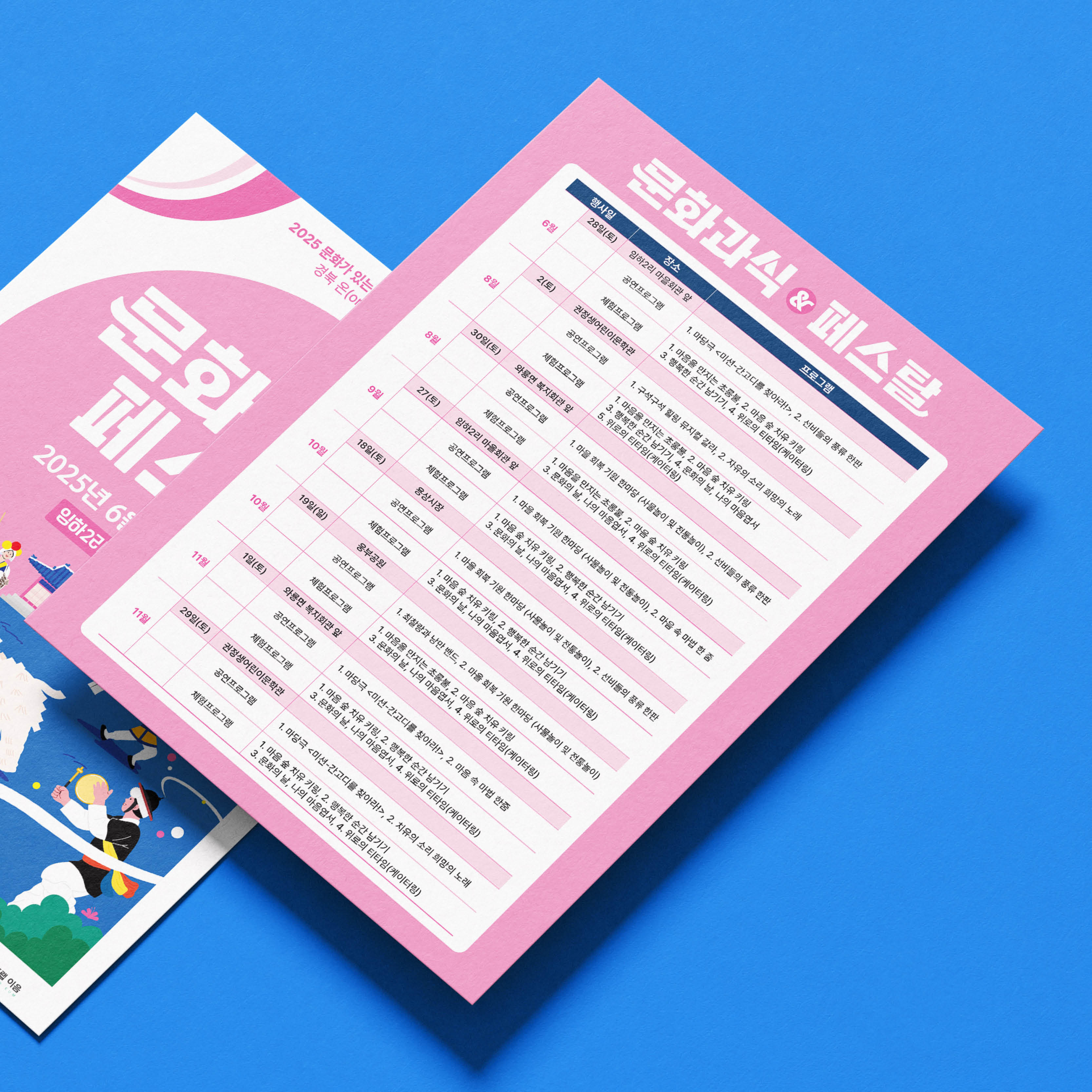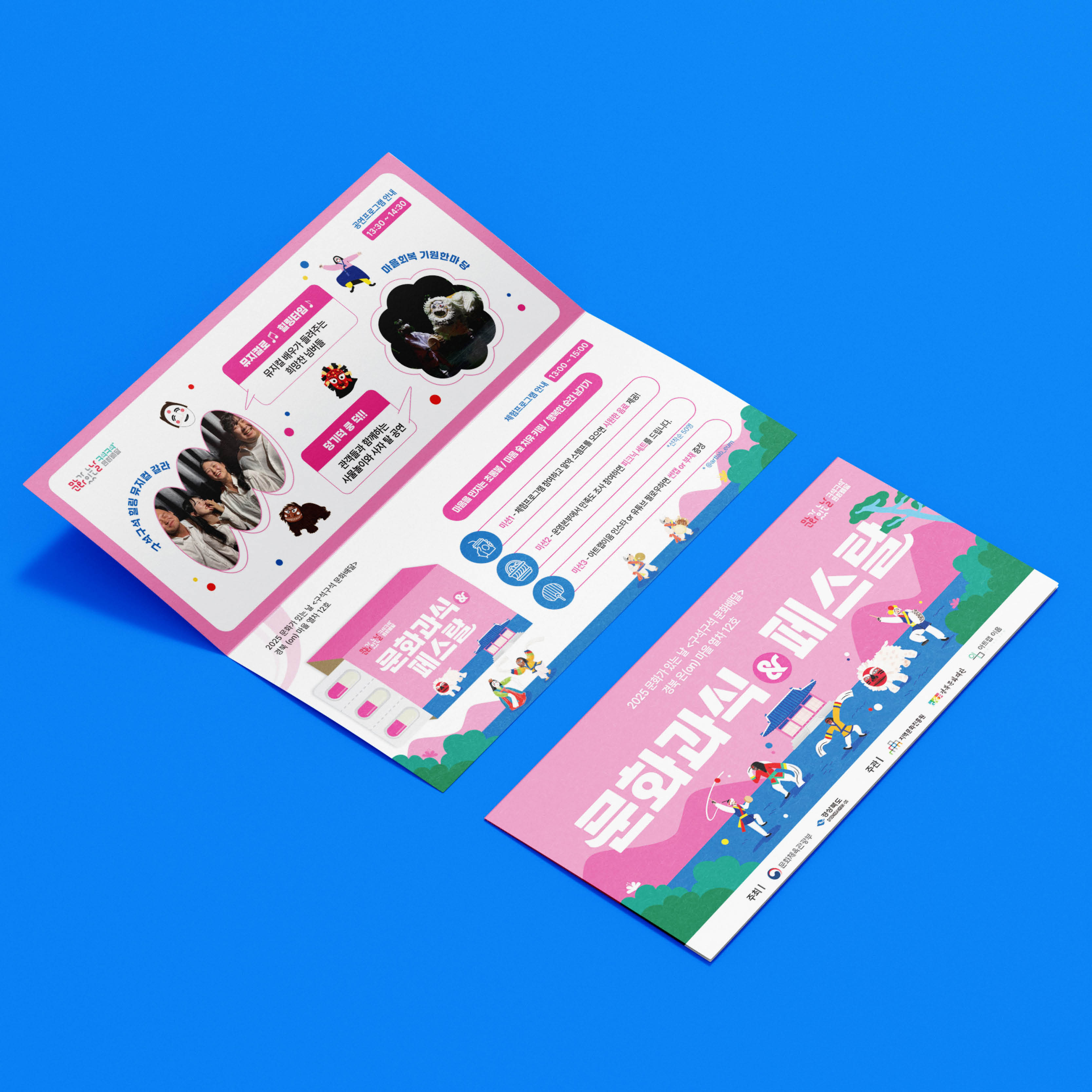 지역 문화행사와 전통문화 축제를 위한 행사 디자인입니다. 각 행사 특성에 맞춰 직관적인 정보 전달과 현대적인 그래픽 표현을 적용하였습니다.