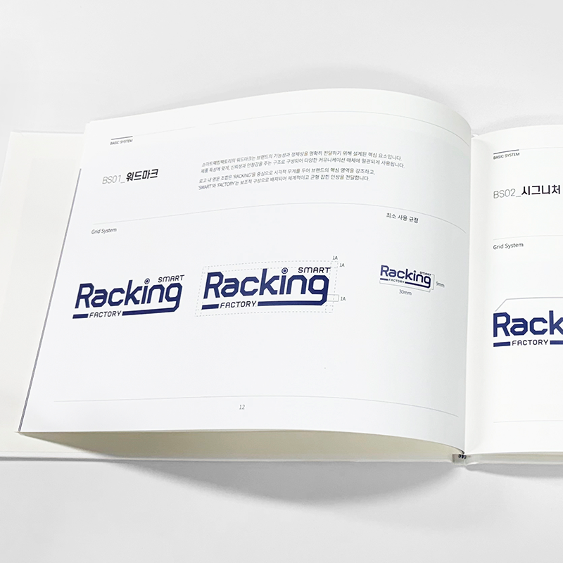 제품 특성에 맞춘 구조로 신뢰성과 안정감을 전달합니다. BI는 ‘RACKING’을 중심으로 핵심 영역을 강조하고, ‘SMART’와 ‘FACTORY’를 보조적으로 배치해 체계적이고 균형 잡힌 인상을 완성합니다.