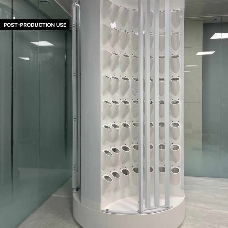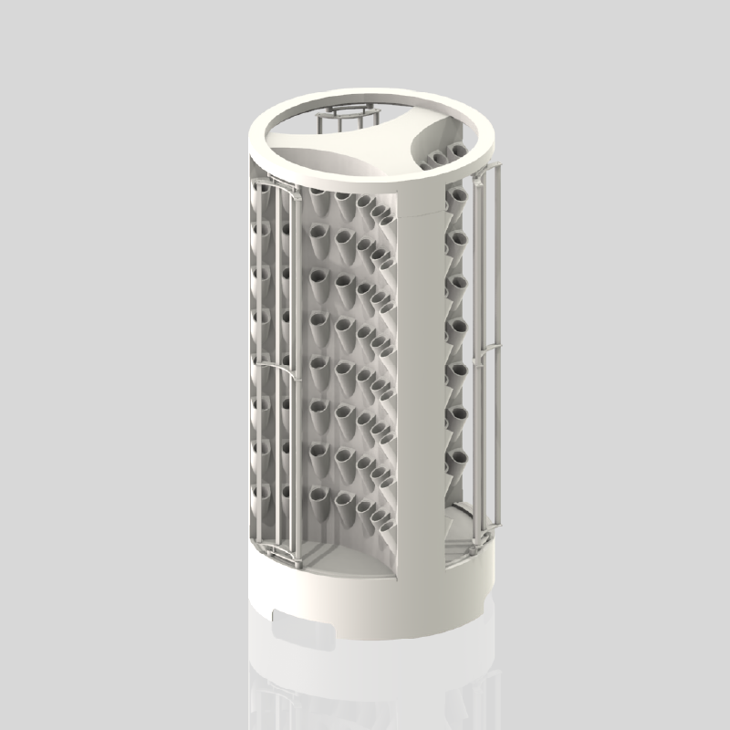 기존의 수평형 스마트팜의 한계를 넘어서기 위한 수직형 재배대로, AGV를 활용하여 재배대를 수확 공간으로 이동, 수직 방향으로 높이 조절이 가능하여 공간 효율성을 극대화할 수 있는 스마트팜 모듈입니다.