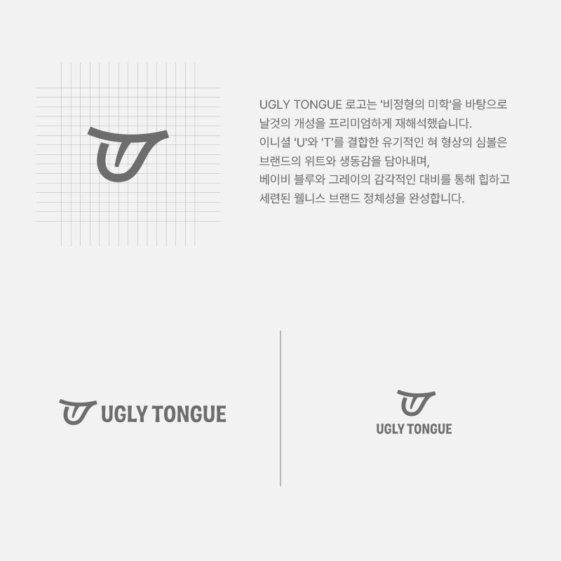 UGLY TONGUE는 ‘비정형의 미학’을 바탕으로 날것의 개성을 프리미엄하게 재해석한 브랜딩입니다. U·T 결합 심볼과 세련된 컬러 대비로 힙한 웰니스 정체성을 구축하여, 독창적인 비주얼 솔루션을 제시합니다.