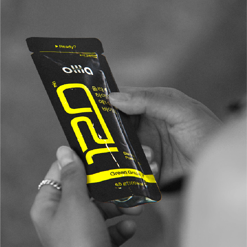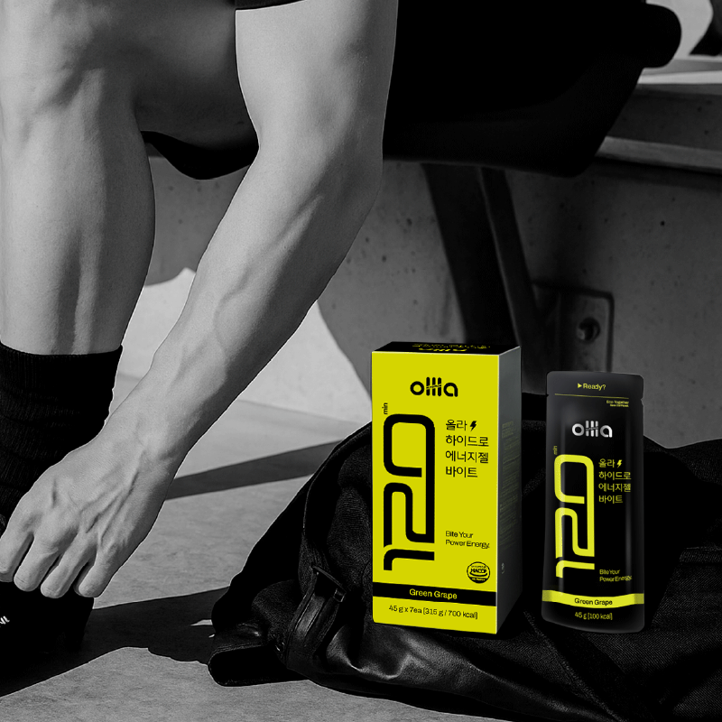 올라 뉴트리션 하이드로겔 바이트 패키지는 스포츠 에너지 브랜드의 전문성과 강인함을 표현했습니다. 블랙 컬러로 무게감과 안정감을 주고, 네온 옐로우 포인트로 역동적인 에너지를 강조했습니다.
