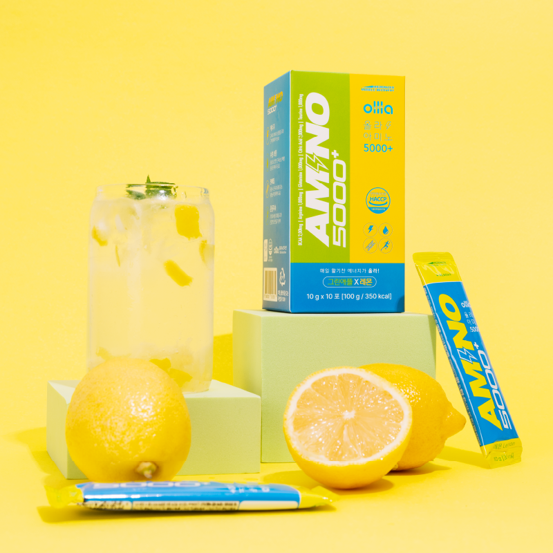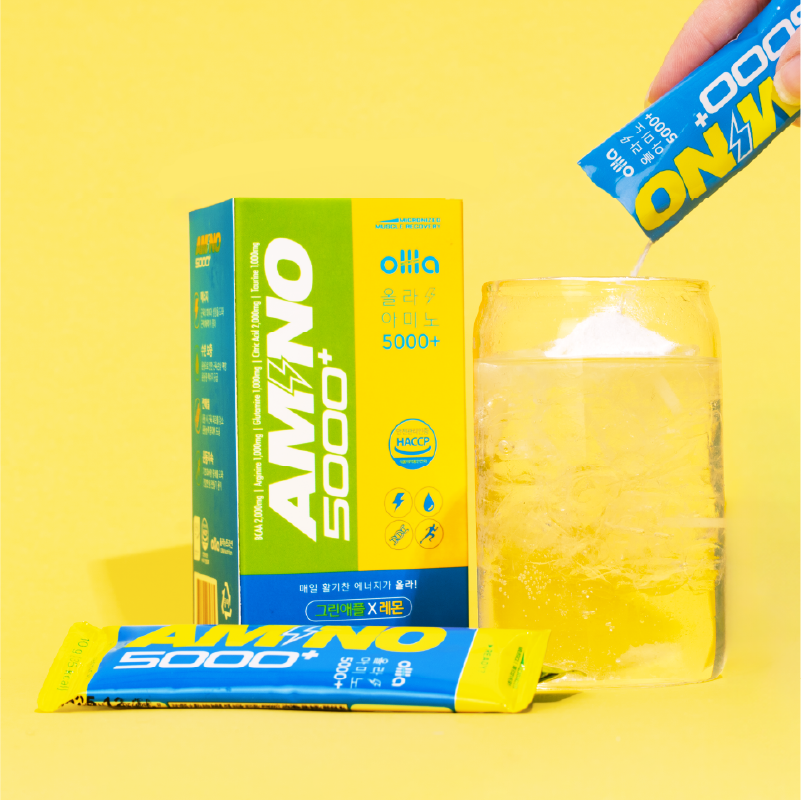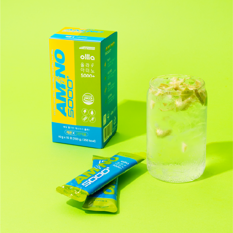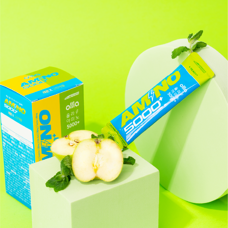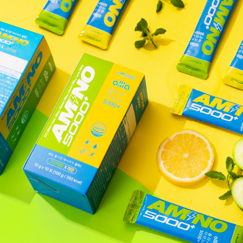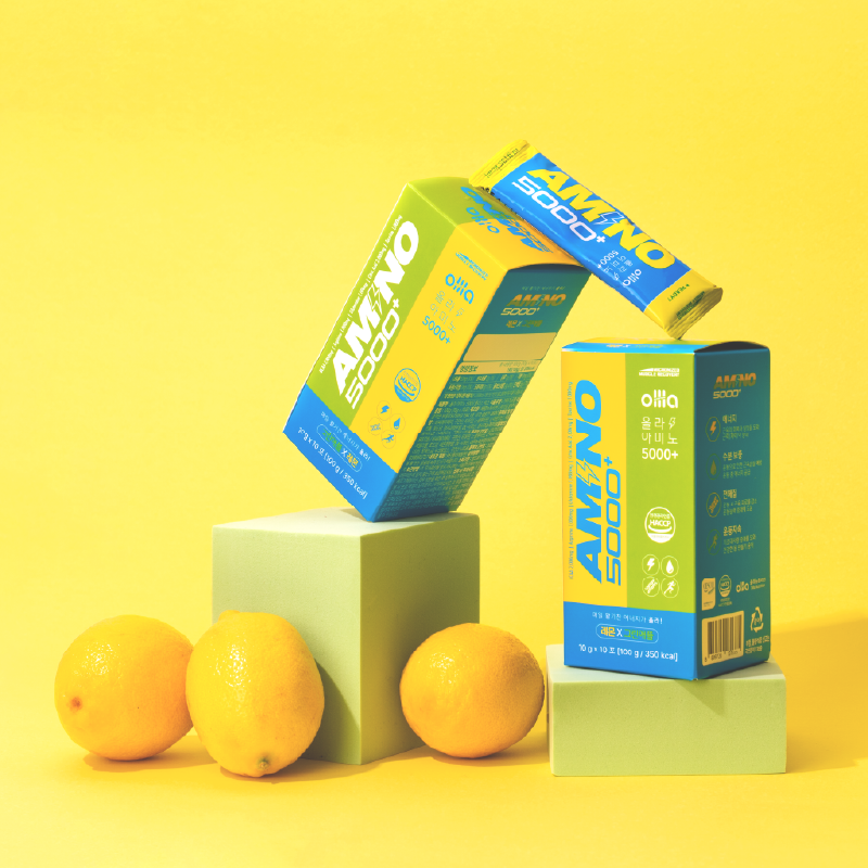 올라 뉴트리션 아미노 5000+ 패키지는 그린애플과 레몬을 상징하는 컬러에 블루를 더해 시원상큼함을 표현했습니다. 앞뒤 반전 디자인으로 패키지에 변화를 주어 다양한 각도에서도 신선하게 보이도록 구성했습니다.