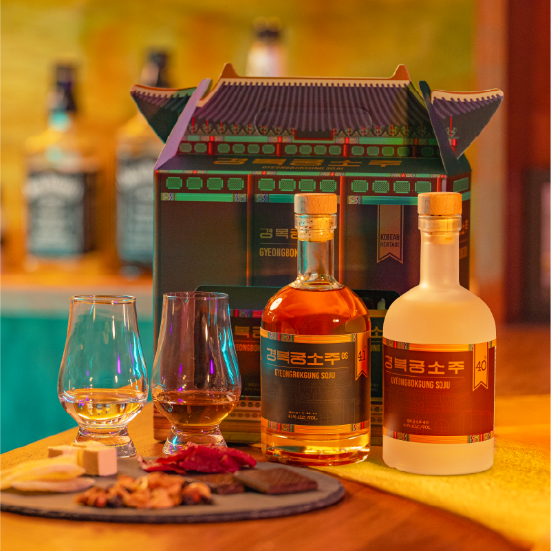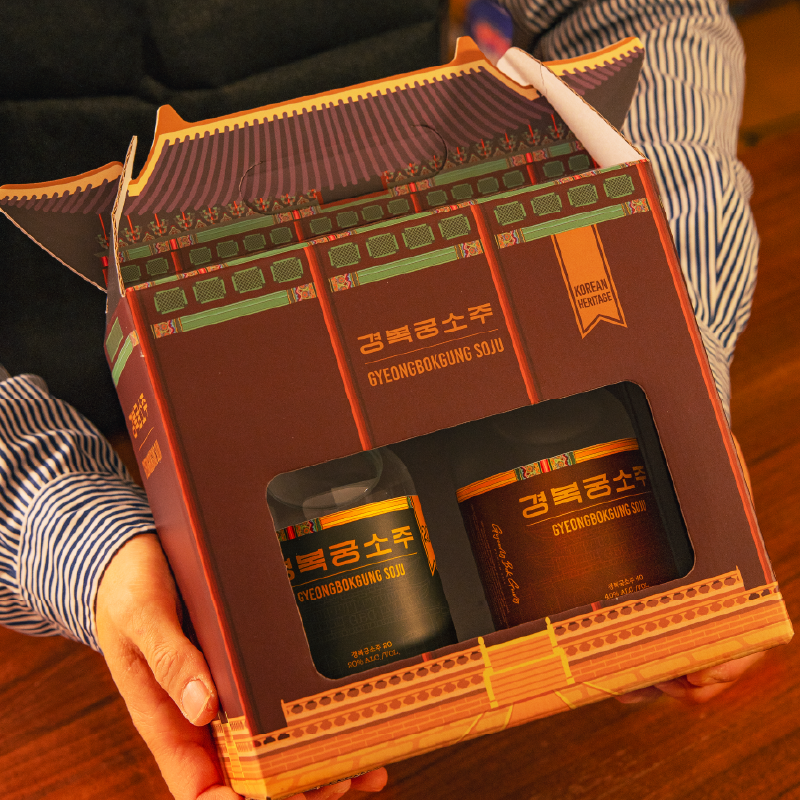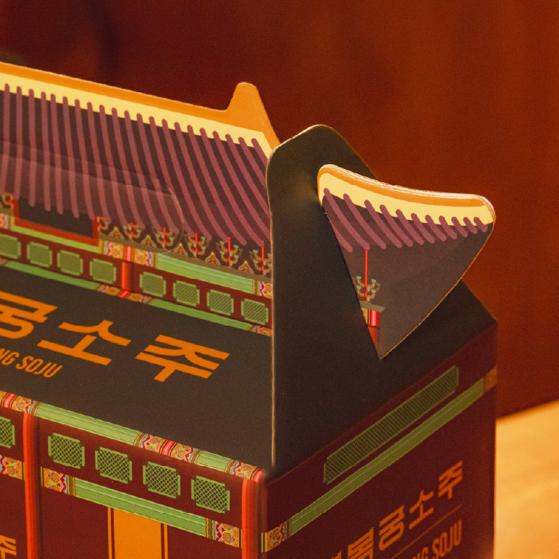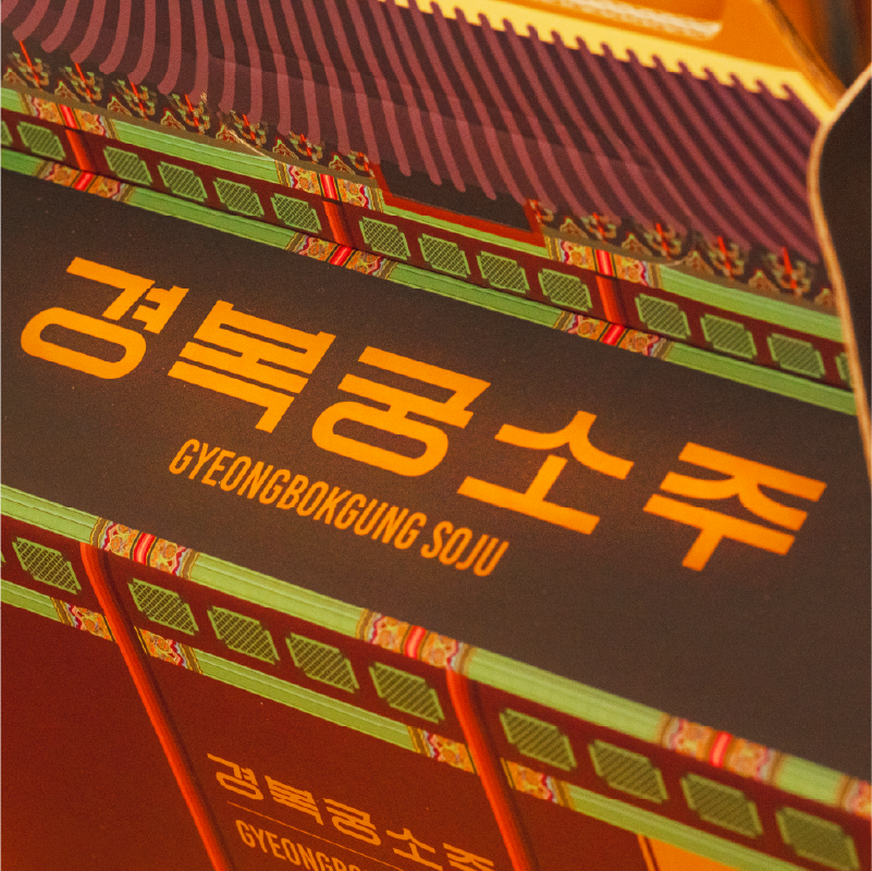 경복궁소주 2025 신규 키트로, 경복궁을 모티프로 전통 아이덴티티를 담았습니다. 기와와 단청 요소로 궁의 형태를 구현하고, 타공 구조로 제품 정보를 확인할 수 있으며 다양한 도수 라인업을 담도록 설계했습니다.